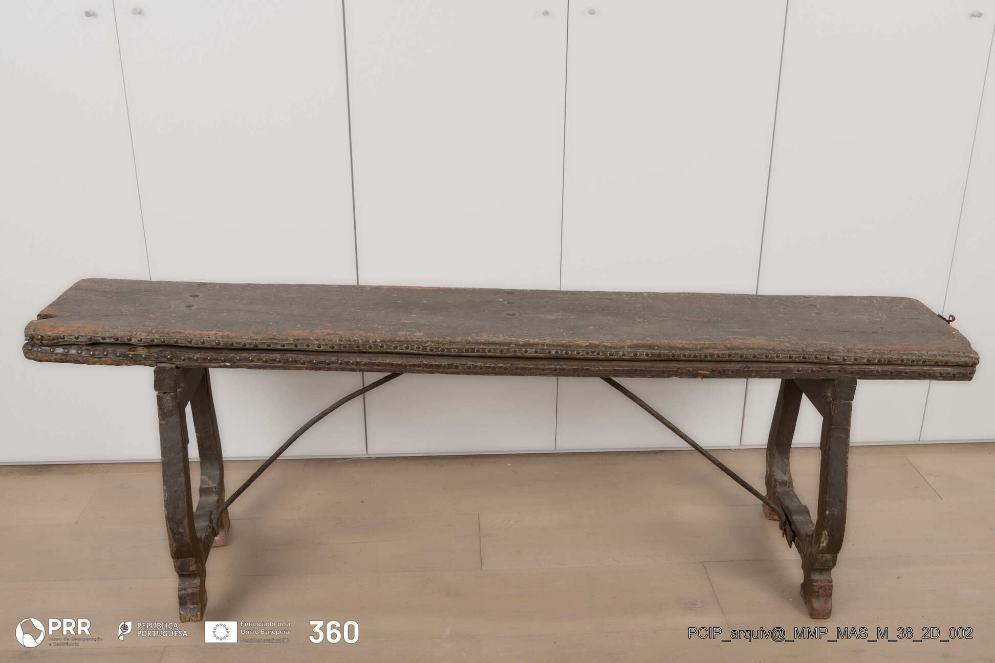 Matéria/Técnica: Castanho pintado; assento estofado e revestido de couro pespontado, fixado por tira de couro e pregaria.; Cronologia: Século XVII; Autoria: Desconhecida; Dimensões: Altura: 84 cm x Largura: 41,5 cm x Comprimento: 182 cm.