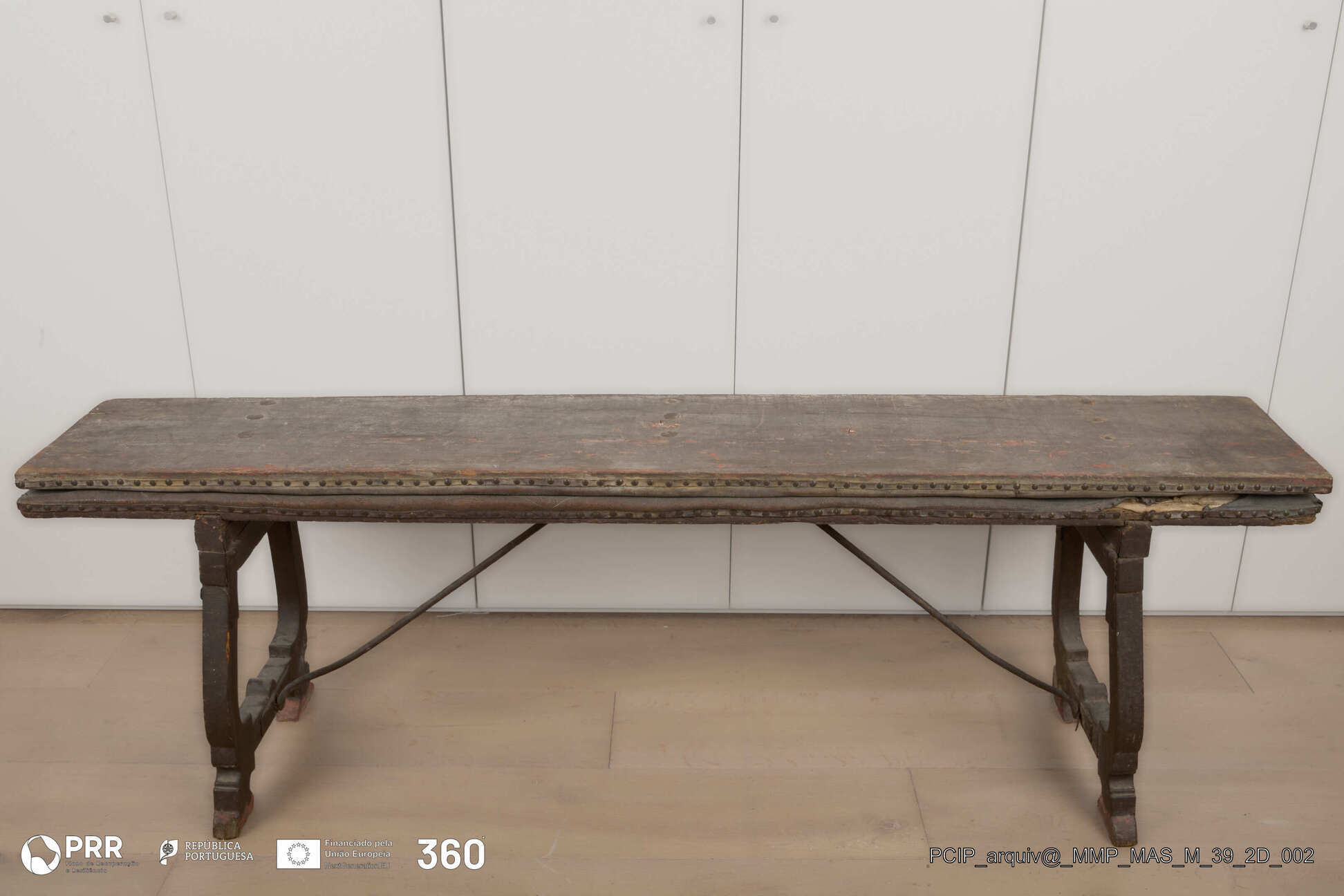 Matéria/Técnica: Castanho pintado; assento estofado e revestido de couro pespontado, fixado por tira de couro e pregaria.; Cronologia: Século XVII; Autoria: Desconhecida; Dimensões: Altura: 88 cm x Largura: 41 cm x Comprimento: 182 cm.