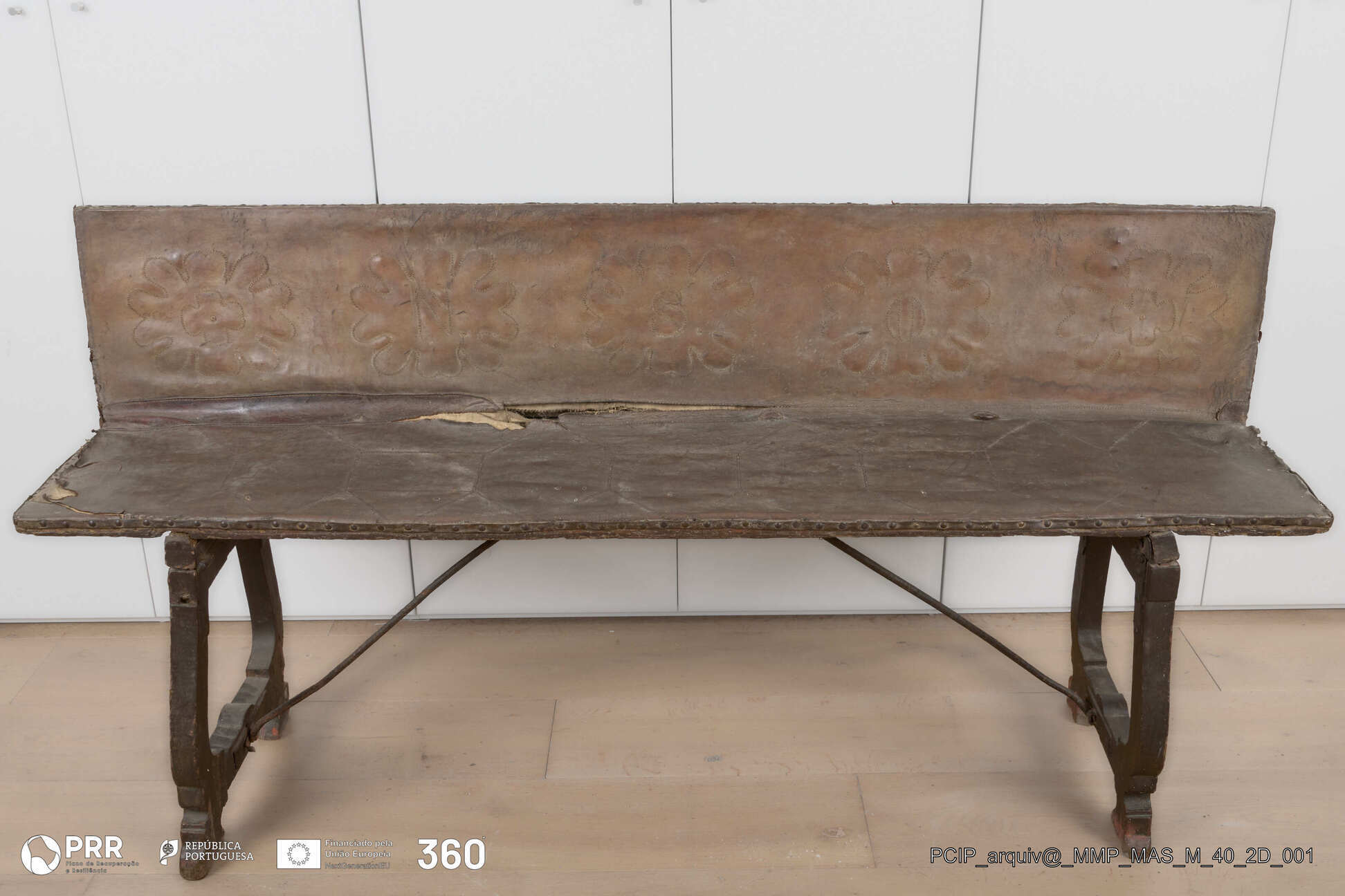 Matéria/Técnica: Castanho pintado, assento estofado e revestido de couro pespontado, fixado por tira de couro e pregaria.; Cronologia: Século XVII; Autoria: Desconhecida; Dimensões: Altura: 87 cm x Largura: 42 cm x Comprimento: 174 cm.