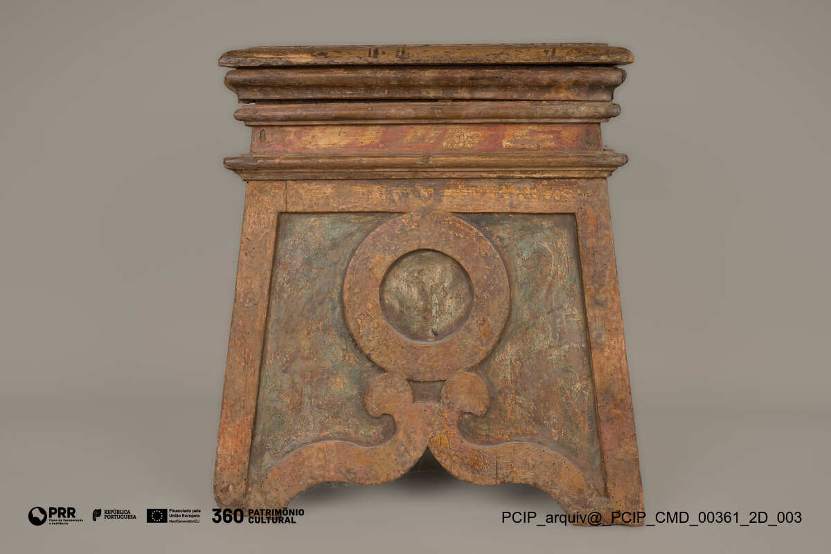 Matéria/Técnica: Madeira; Cronologia: XVIII; Autoria: Desconhecida; Dimensões: Altura: 54 cm; Largura: 45 cm; Profundidade: 36 cm.