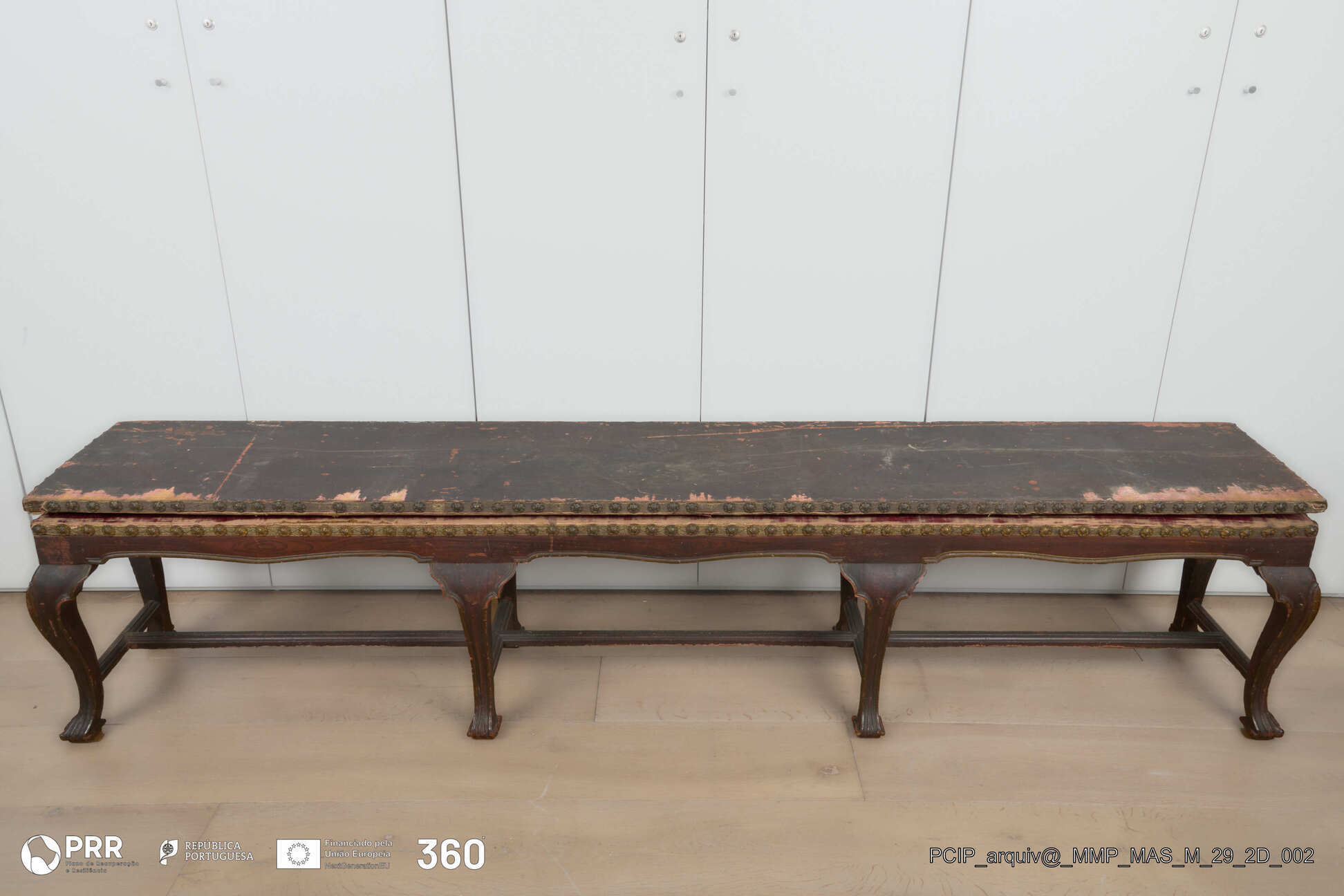 Matéria/Técnica: Castanho entalhado e pintado ( pintura de fingimento simulando os veios de outra madeira ); metal fundido e dourado; Cronologia: Século XVIII; Autoria: Desconhecida; Dimensões: Altura: 75,5 cm x Largura: 49,8 cm x Comprimento: 225,5 cm.