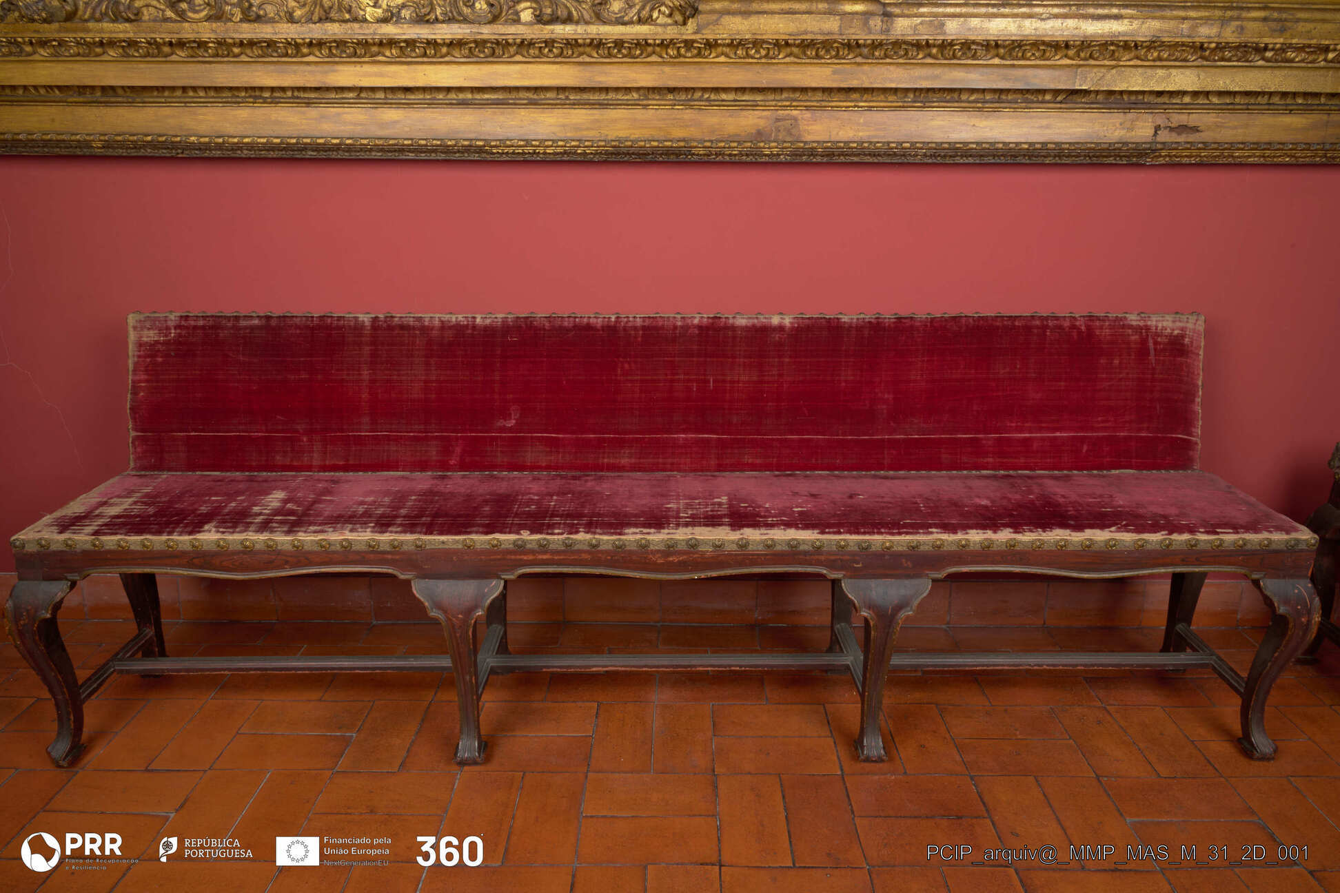 Matéria/Técnica: Castanho entalhado e pintado ( pintura de fingimento simulando os veios de outra madeira); metal fundido e dourado; Cronologia: Século XVIII; Autoria: Desconhecida; Dimensões: Altura: 76 cm x Largura: 48 cm x Comprimento: 225 cm.