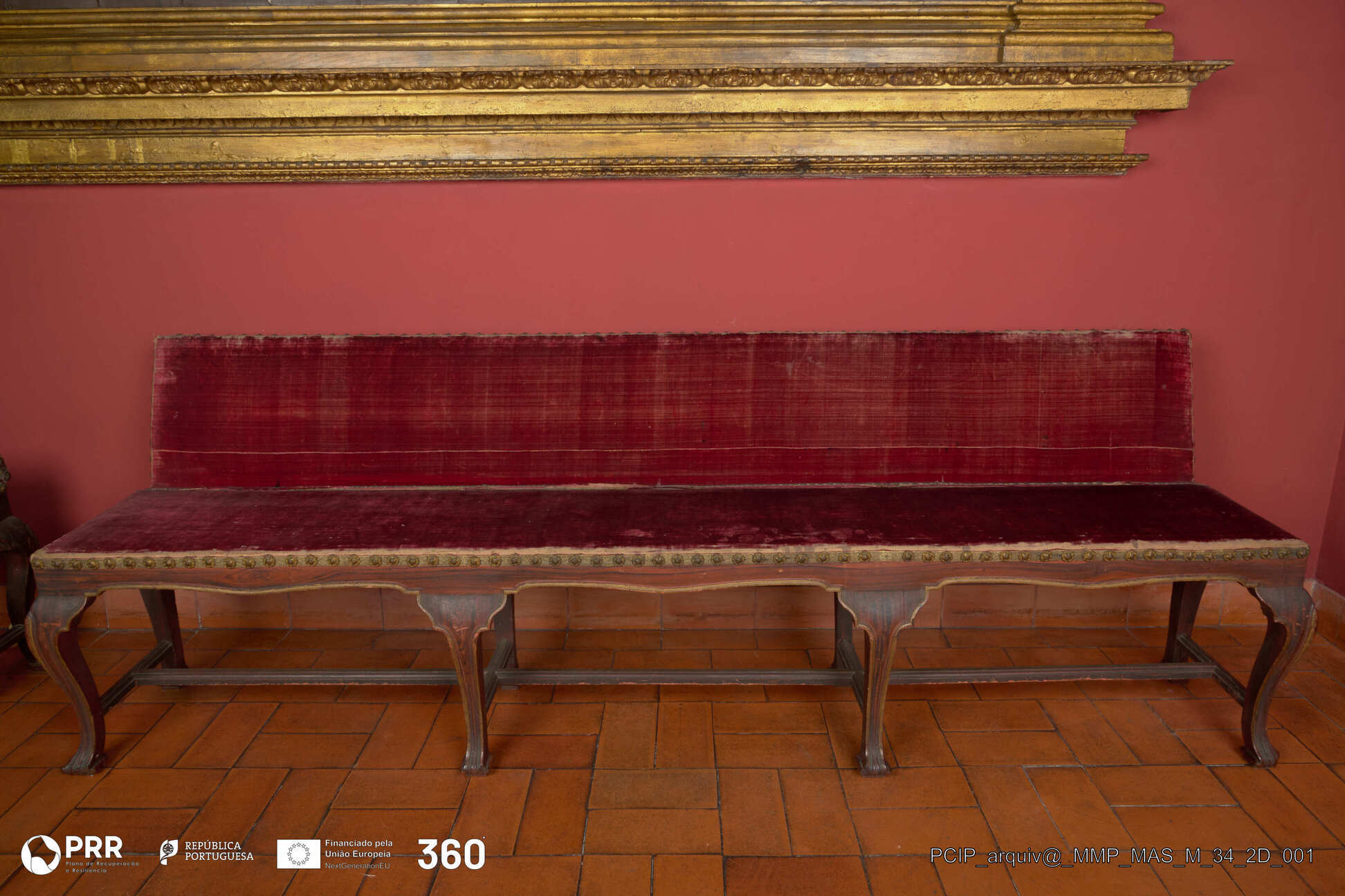 Matéria/Técnica: Castanho entalhado e pintado ( pintura de fingimento simulando os veios de outra madeira ); metal fundido e dourado.; Cronologia: Século XVIII; Autoria: Desconhecida; Dimensões: Altura: 73,5 cm x Largura: 53,5 cm x Comprimento: 225 cm.