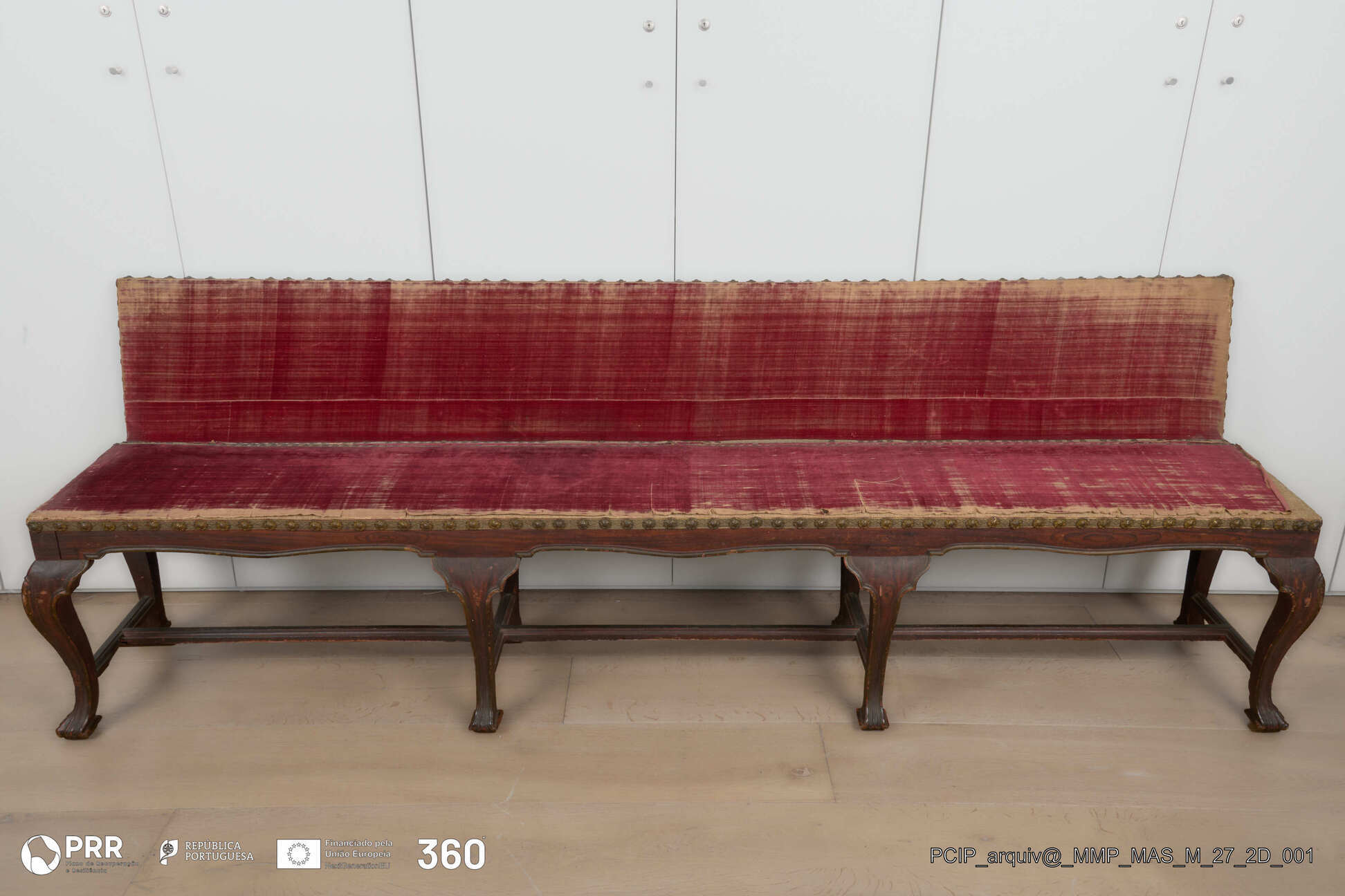 Matéria/Técnica: Castanho entalhado e pintado ( pintura de fingimento simulando os veios de outra madeira ); metal fundido e dourado; Cronologia: Século XVIII; Autoria: Desconhecida; Dimensões: Altura: 76 cm x Largura: 49 cm x Comprimento: 225,5 cm.
