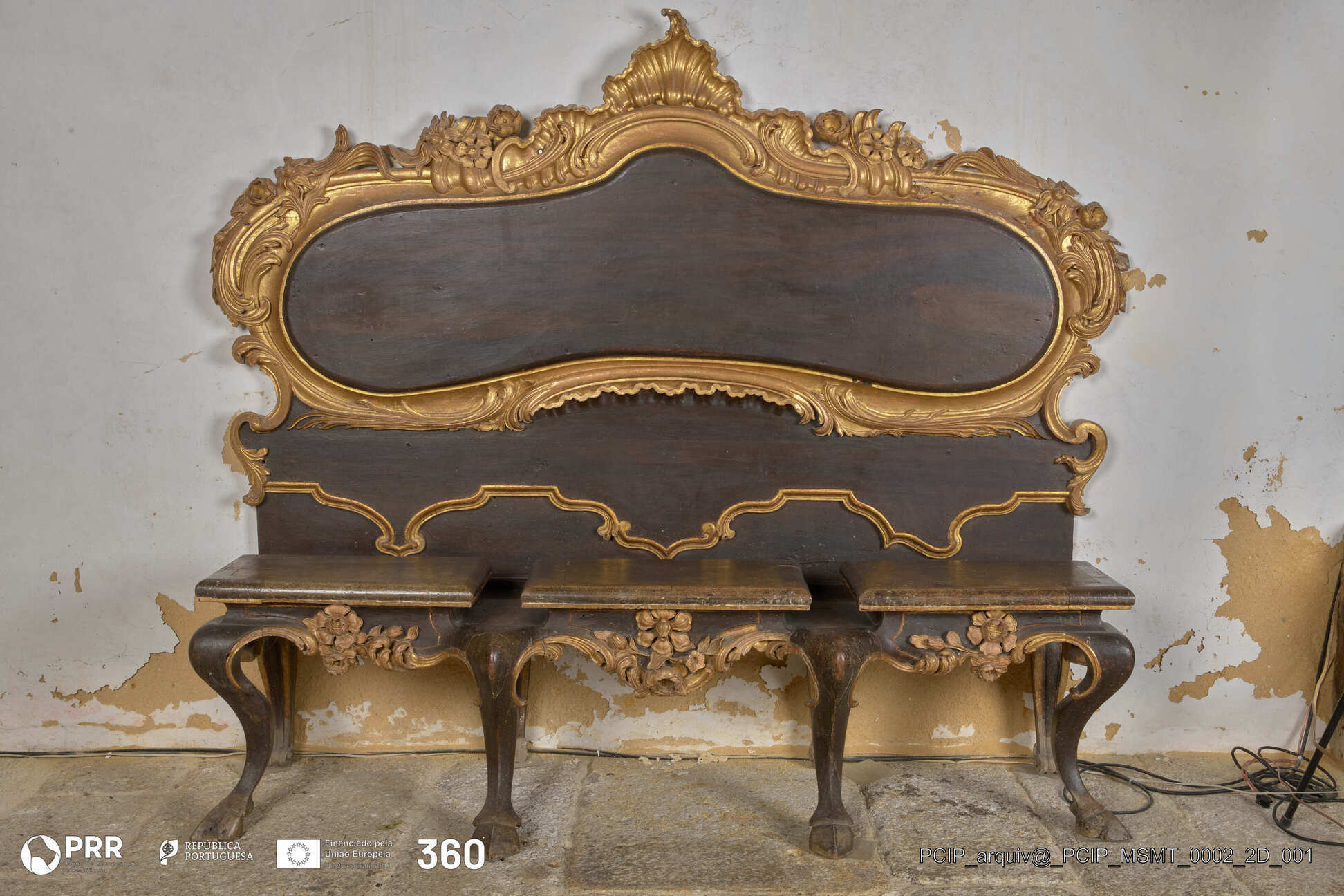Matéria/Técnica: Madeira e folha de ouro / Entalhamento e douramento; Cronologia: 1761 - 1764; Autoria: Frei José Santo António Vilaça; Dimensões (cm): 161 x 195 x 63.