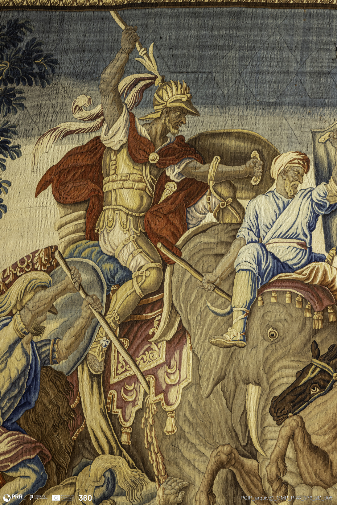 Matéria/Técnica: Tapeçaria de liço; Cronologia: Século XVIII; Autoria: Desconhecida; Dimensões: Altura: 442 cm x Largura: 447 (campo da tapeçaria: 340; cercadura: 107) cm.