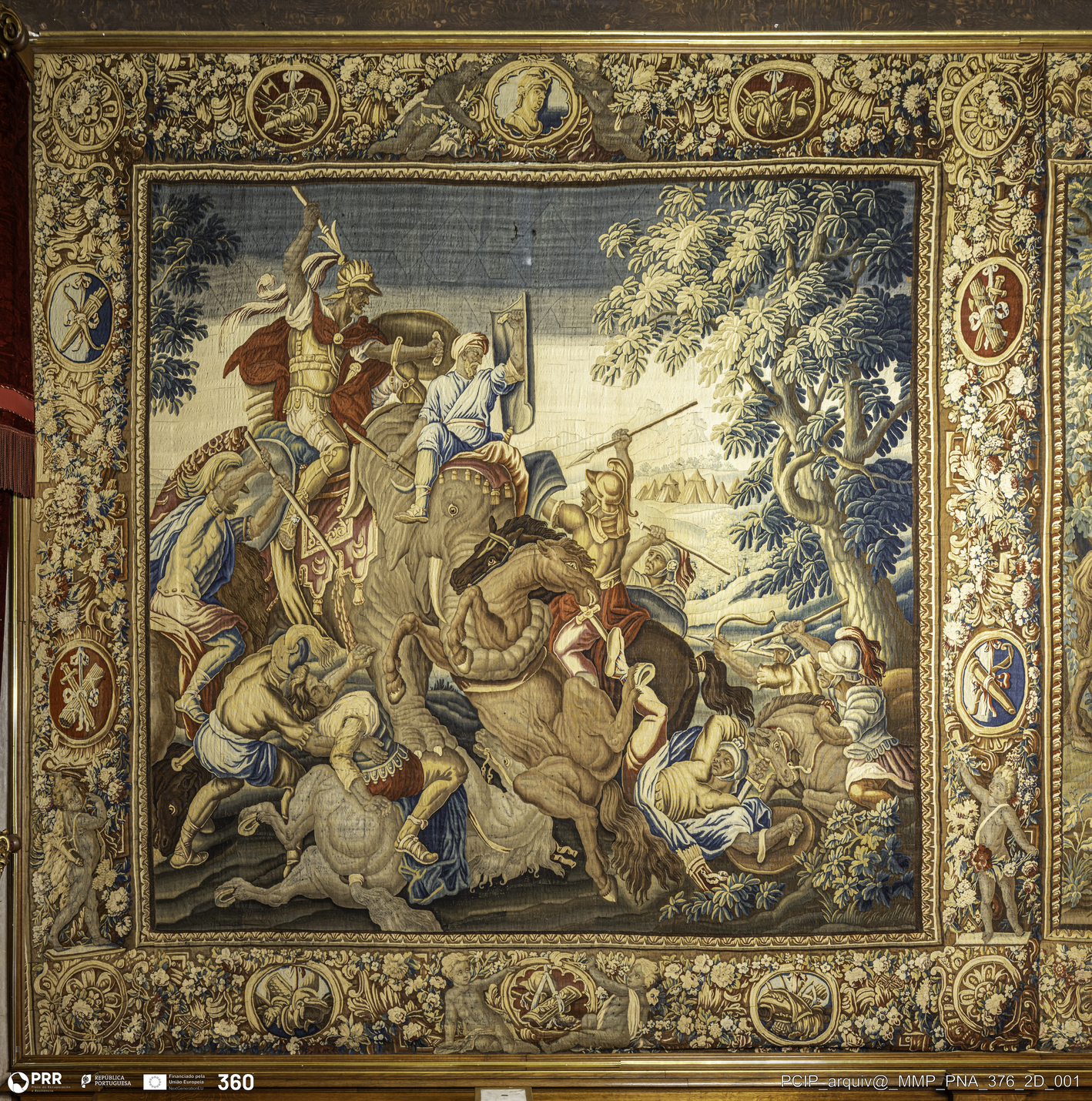 Matéria/Técnica: Tapeçaria de liço; Cronologia: Século XVIII; Autoria: Desconhecida; Dimensões: Altura: 442 cm x Largura: 447 (campo da tapeçaria: 340; cercadura: 107) cm.