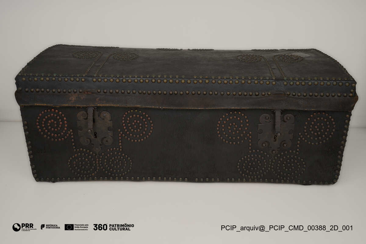 Matéria/Técnica: Madeira; ferro; pele.; Cronologia: XVIII; Autoria: Desconhecida; Dimensões: Altura: 50 cm; Largura: 120 cm; Profundidade: 68 cm.