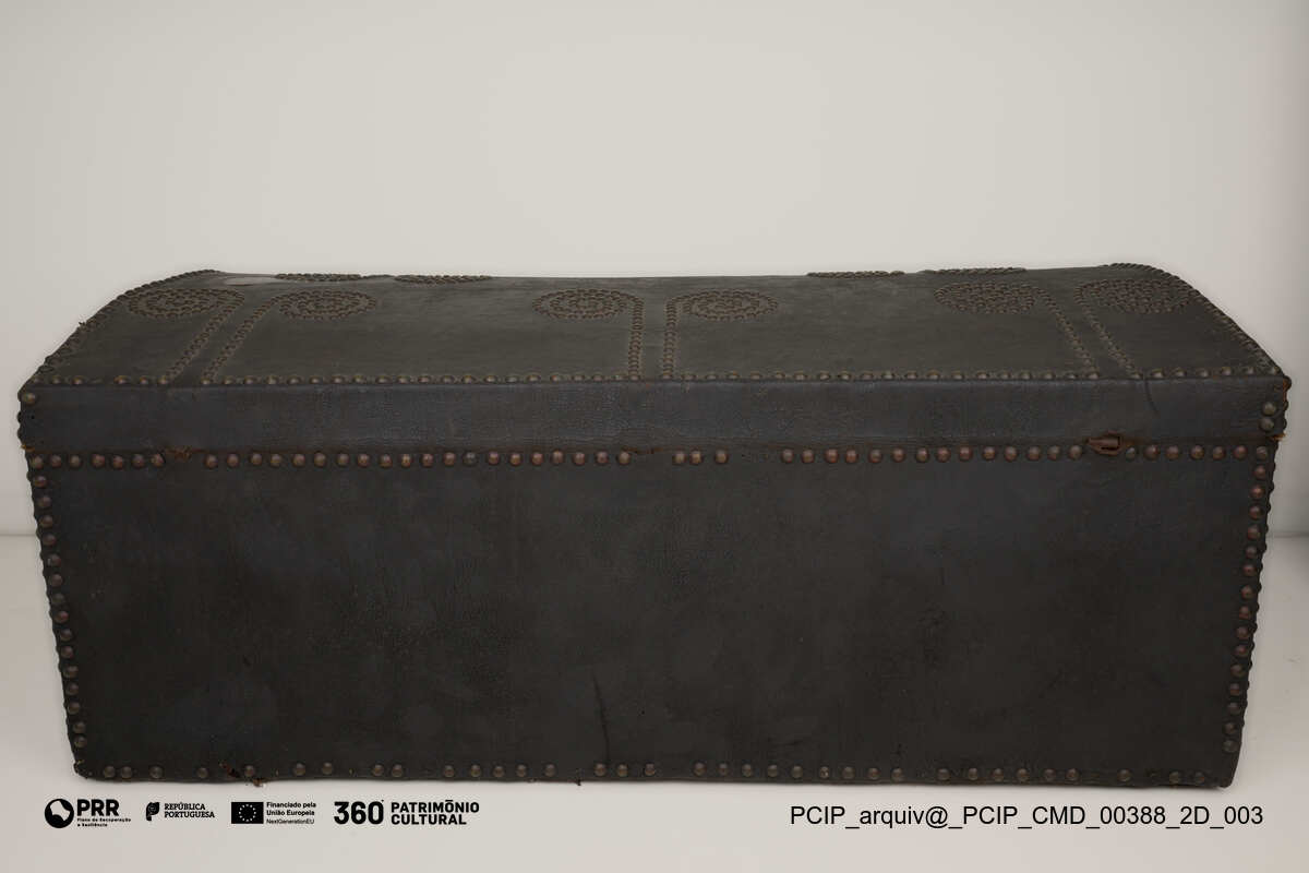Matéria/Técnica: Madeira; ferro; pele.; Cronologia: XVIII; Autoria: Desconhecida; Dimensões: Altura: 50 cm; Largura: 120 cm; Profundidade: 68 cm.