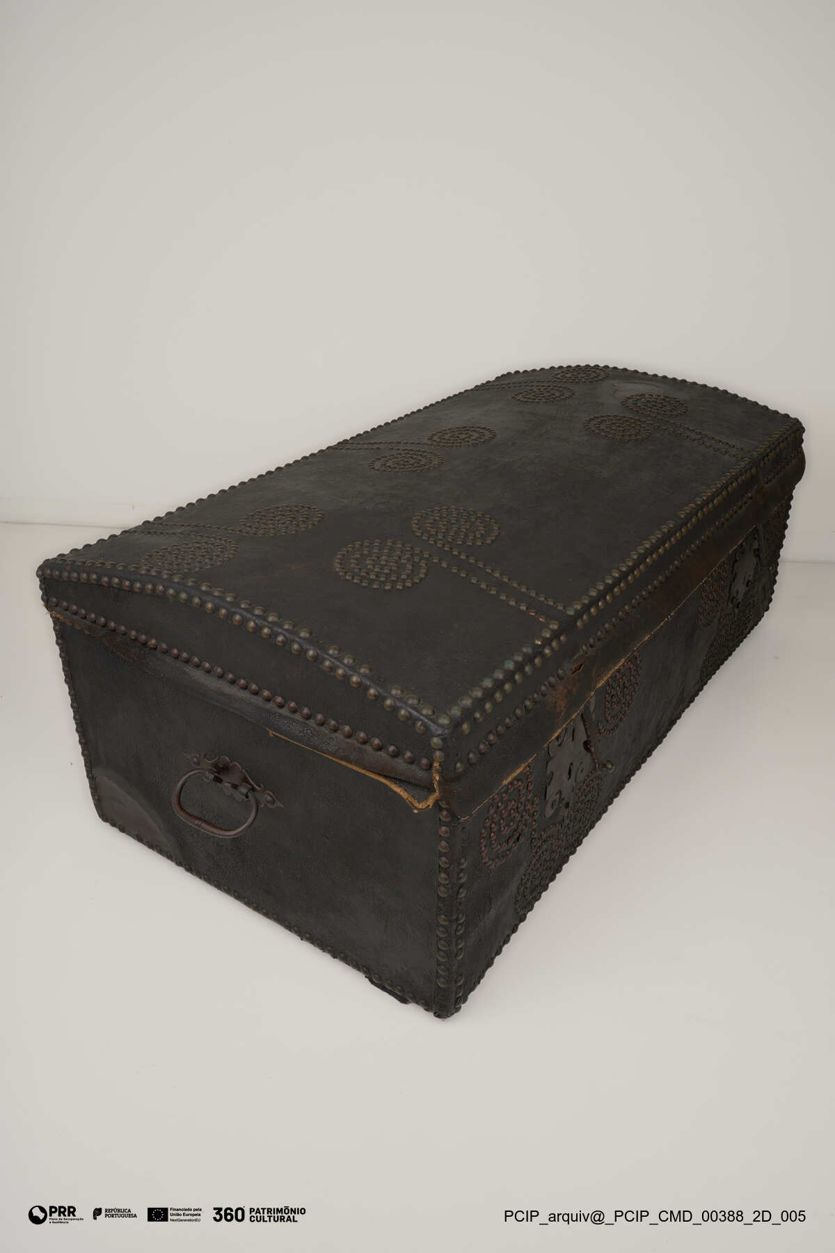 Matéria/Técnica: Madeira; ferro; pele.; Cronologia: XVIII; Autoria: Desconhecida; Dimensões: Altura: 50 cm; Largura: 120 cm; Profundidade: 68 cm.