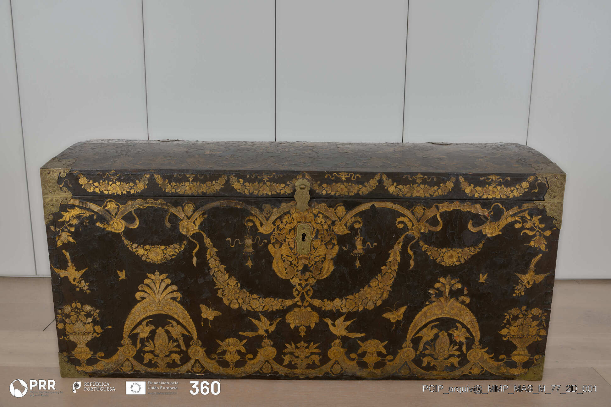 Matéria/Técnica: Madeira lacada a negro com decoração feita com prata, ouro e cobre.; Cronologia: 1770-1800; Autoria: Desconhecida; Dimensões: Altura: 60 cm x Largura: 56 cm x Comprimento: 127,5 cm.