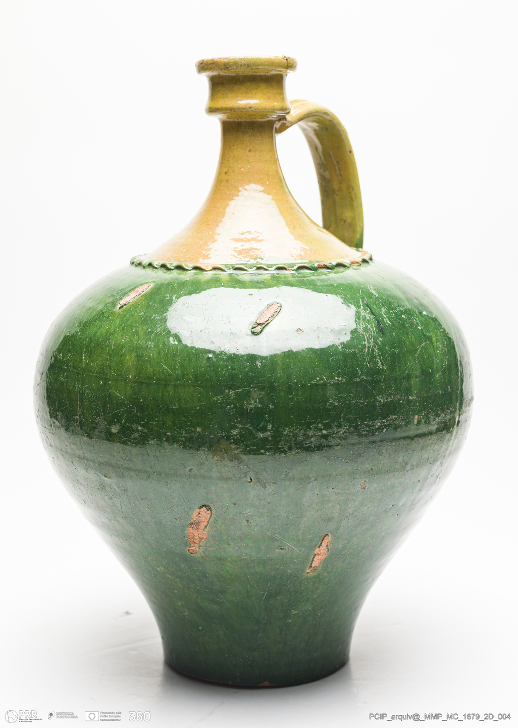Matéria/Técnica: Barro vermelho rodado e moldado. Vidrado polícromo: verde e camurça; Cronologia: século XX; Autoria: Desconhecido / Olaria de António Oliveira, Caldas da Rainha, Portugal; Dimensões (cm): Altura: 36; Diâmetro: 26.