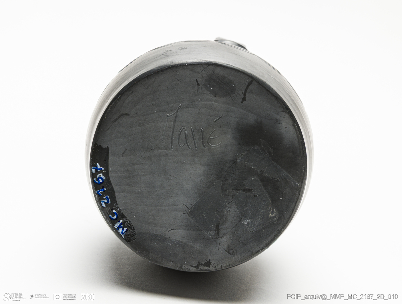 Matéria/Técnica: Barro negro rodado e moldado; Cronologia: 1991; Autoria: Mané. Beira Alta; Dimensões (cm): Altura: 14; Diâmetro: 14.