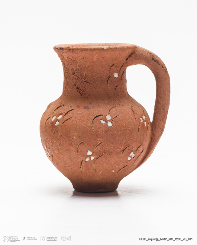 Matéria/Técnica: Barro vermelho rodado e modelado. Empedrado: composição decorativa que se obtém por incrustação de pedrinhas brancas de quartzo na superfície do objeto cerâmico e que ganha, com a cozedura, particular realce sobre a cor vermelha; Cronologia: século XX; Autoria: Desconhecido / Alto Alentejo - Nisa; Dimensões (cm): Altura: 36; Diâmetro: 20.