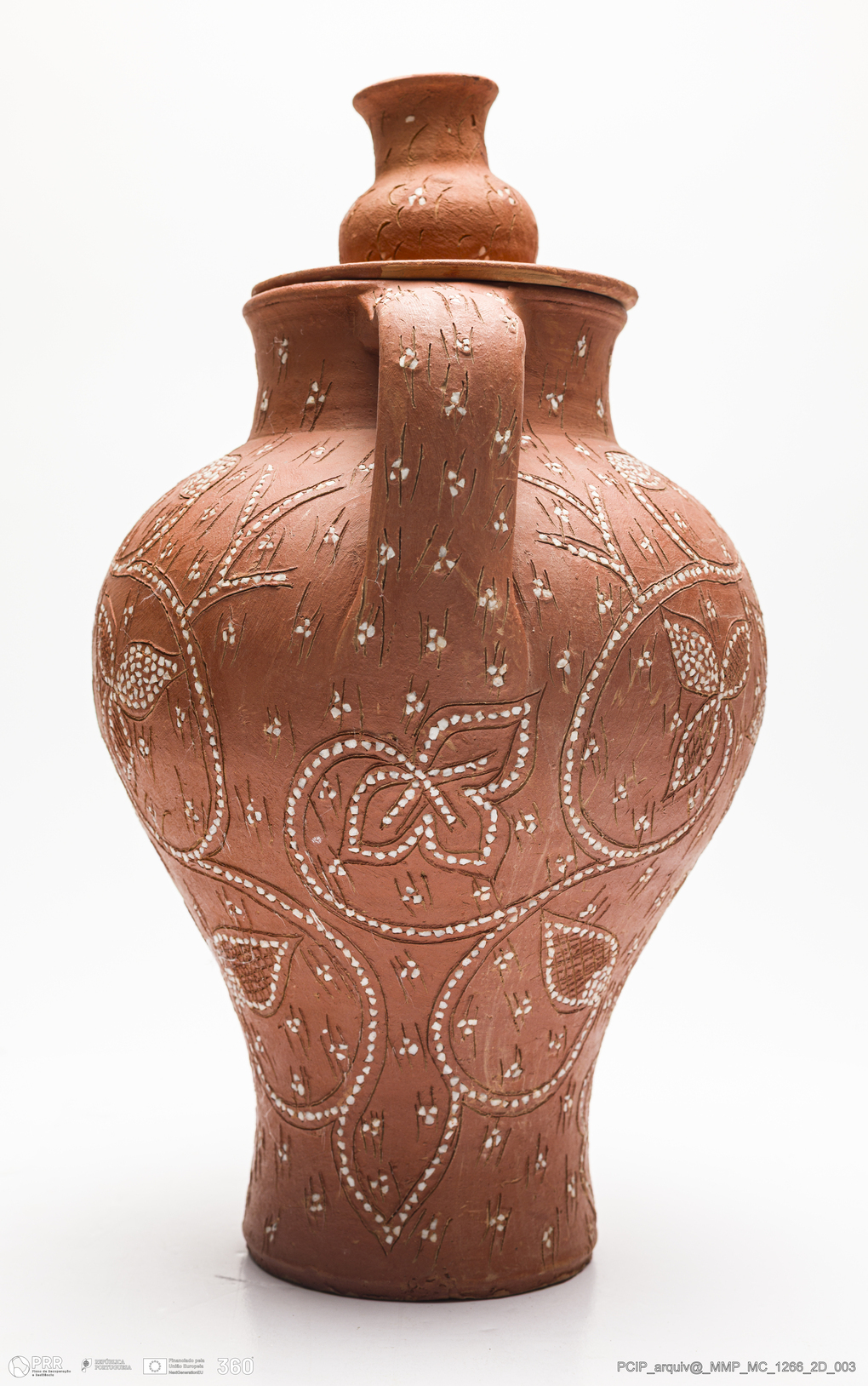 Matéria/Técnica: Barro vermelho rodado e modelado. Empedrado: composição decorativa que se obtém por incrustação de pedrinhas brancas de quartzo na superfície do objeto cerâmico e que ganha, com a cozedura, particular realce sobre a cor vermelha; Cronologia: século XX; Autoria: Desconhecido / Alto Alentejo - Nisa; Dimensões (cm): Altura: 36; Diâmetro: 20.