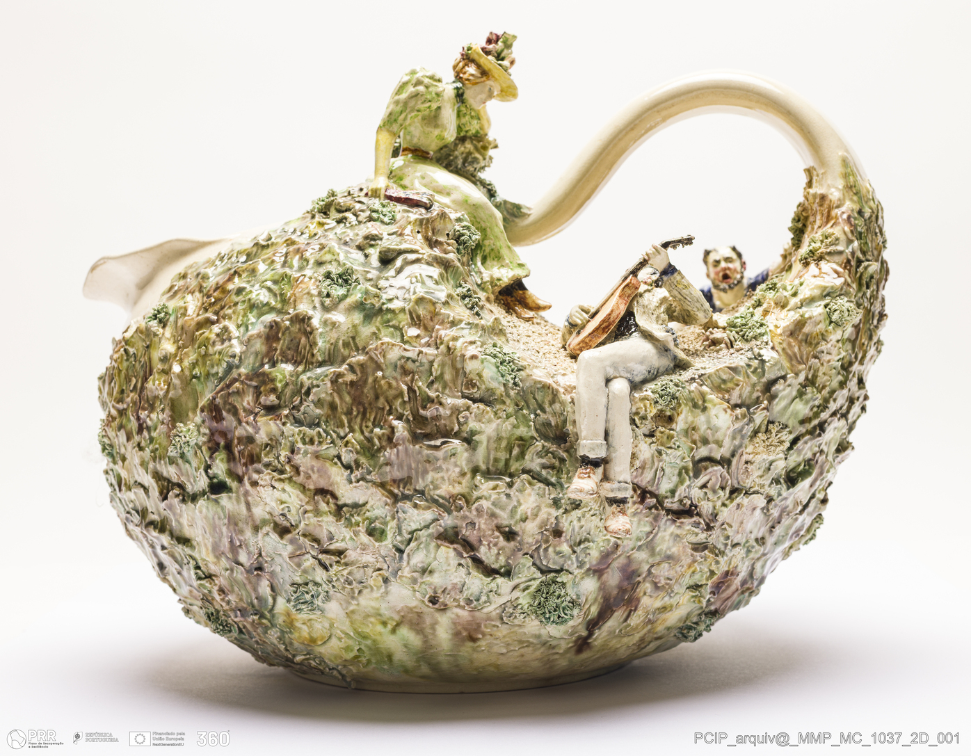 Matéria/Técnica: Faiança modelada e moldada. Vidrado polícromo branco, castanho, verde e amarelo dourado. Paisagem pintada com técnica de aguarela. Fundo esmaltado com vários tons; Cronologia: 1896; Autoria: Rafael Bordalo Pinheiro / Fábrica de Faianças das Caldas da Rainha; Dimensões (cm): Altura: 23; Largura: 32.