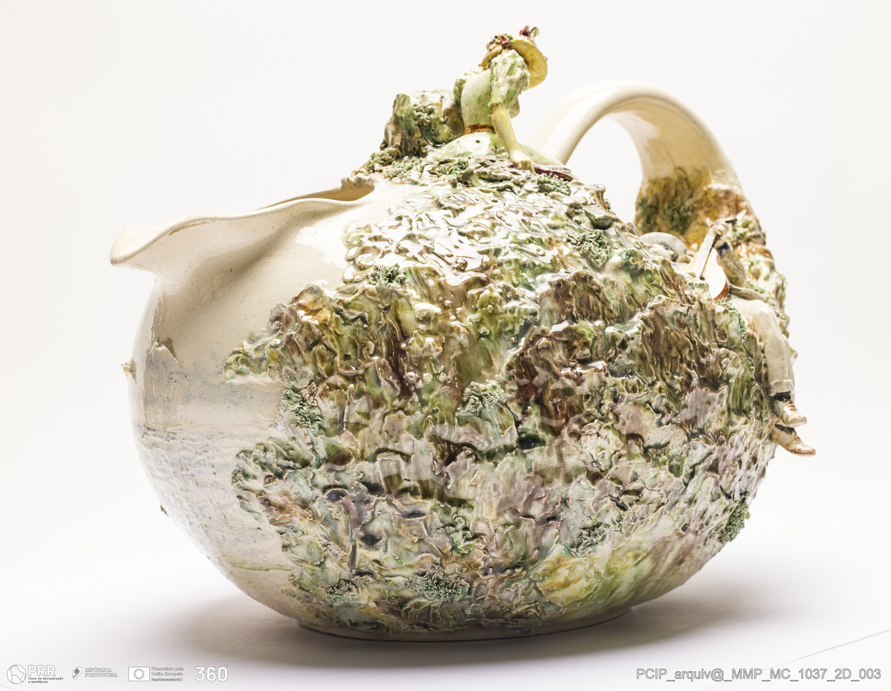 Matéria/Técnica: Faiança modelada e moldada. Vidrado polícromo branco, castanho, verde e amarelo dourado. Paisagem pintada com técnica de aguarela. Fundo esmaltado com vários tons; Cronologia: 1896; Autoria: Rafael Bordalo Pinheiro / Fábrica de Faianças das Caldas da Rainha; Dimensões (cm): Altura: 23; Largura: 32.