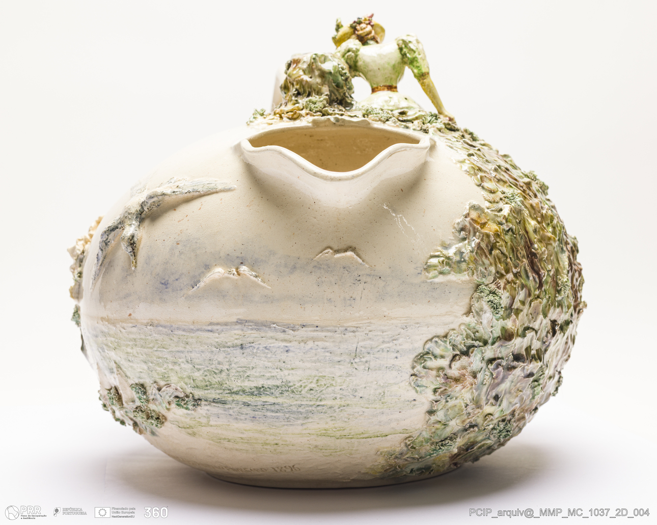 Matéria/Técnica: Faiança modelada e moldada. Vidrado polícromo branco, castanho, verde e amarelo dourado. Paisagem pintada com técnica de aguarela. Fundo esmaltado com vários tons; Cronologia: 1896; Autoria: Rafael Bordalo Pinheiro / Fábrica de Faianças das Caldas da Rainha; Dimensões (cm): Altura: 23; Largura: 32.