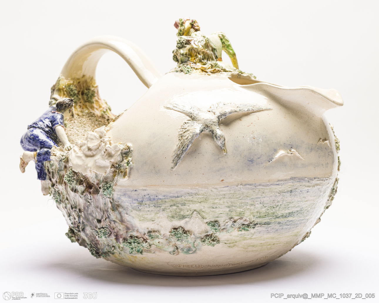 Matéria/Técnica: Faiança modelada e moldada. Vidrado polícromo branco, castanho, verde e amarelo dourado. Paisagem pintada com técnica de aguarela. Fundo esmaltado com vários tons; Cronologia: 1896; Autoria: Rafael Bordalo Pinheiro / Fábrica de Faianças das Caldas da Rainha; Dimensões (cm): Altura: 23; Largura: 32.
