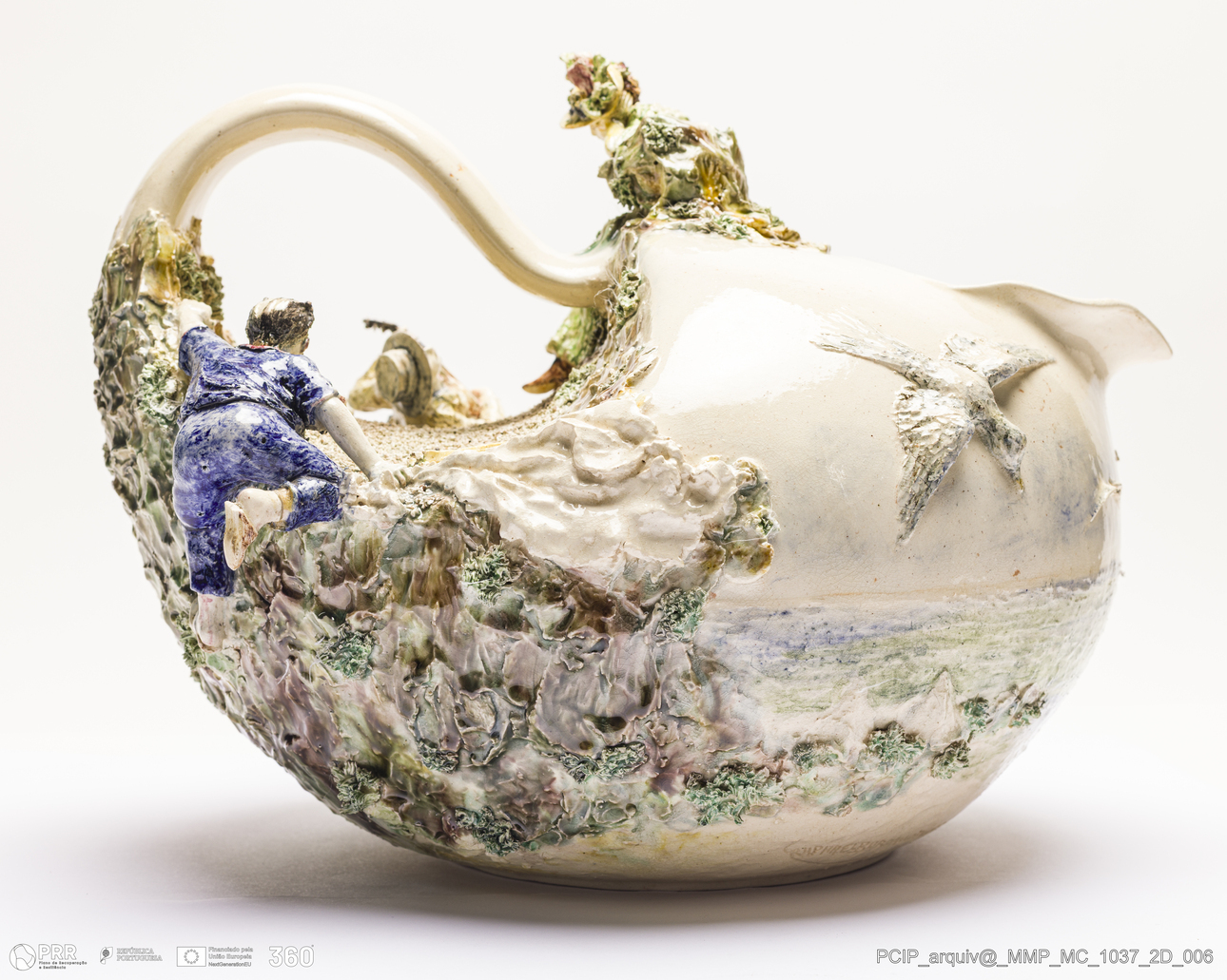 Matéria/Técnica: Faiança modelada e moldada. Vidrado polícromo branco, castanho, verde e amarelo dourado. Paisagem pintada com técnica de aguarela. Fundo esmaltado com vários tons; Cronologia: 1896; Autoria: Rafael Bordalo Pinheiro / Fábrica de Faianças das Caldas da Rainha; Dimensões (cm): Altura: 23; Largura: 32.