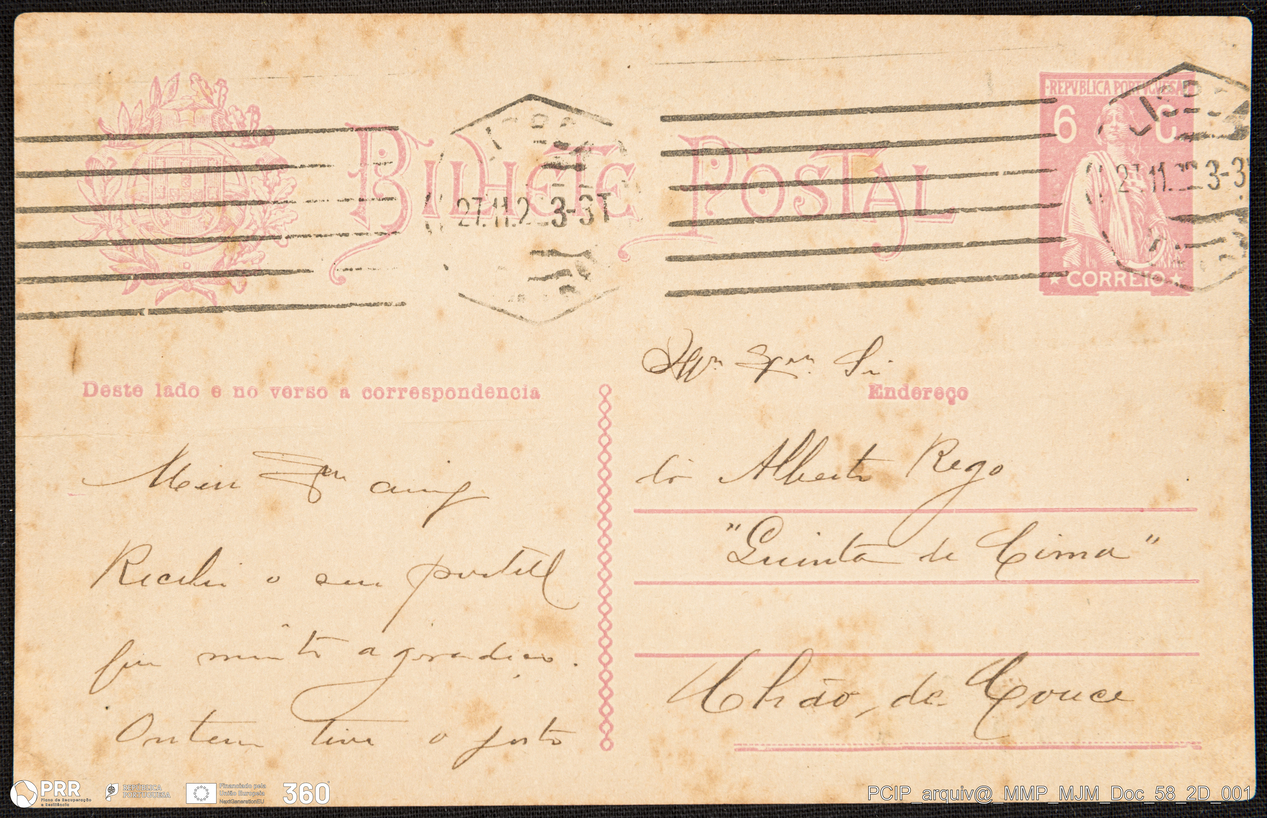 Bilhete Postal de José Malhoa para o dr. Alberto Rego