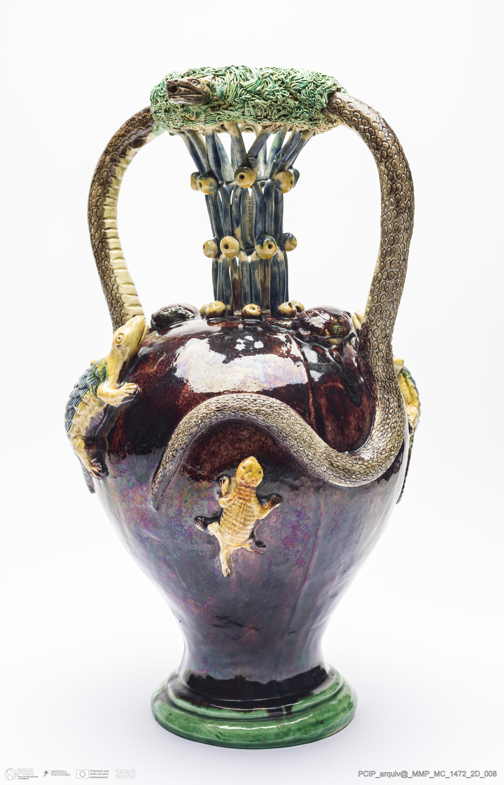 Matéria/Técnica: Barro branco rodado e moldado. Vidrado polícromo: castanho escuro e mel, verde, azul e amarelo; Cronologia: 1870-1887; Autoria: Manuel Cipriano Gomes Mafra / Fábrica De Manuel Cipriano Gomes O Mafra; Dimensões (cm): Altura: 34,5; Largura: 20.