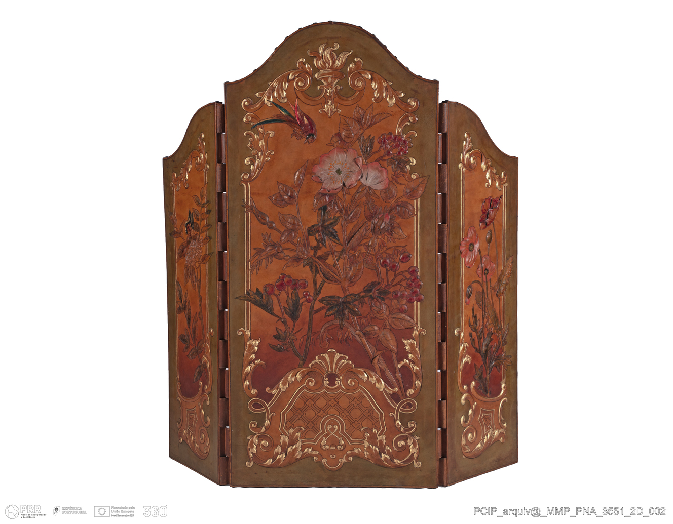 Matéria/Técnica: Couro; 2777618 policroma; ouro; Cronologia: 1850 - 1900; Autoria: Desconhecida; Dimensões (cm): Altura: 155; Largura: 149; Profundidade: 3.