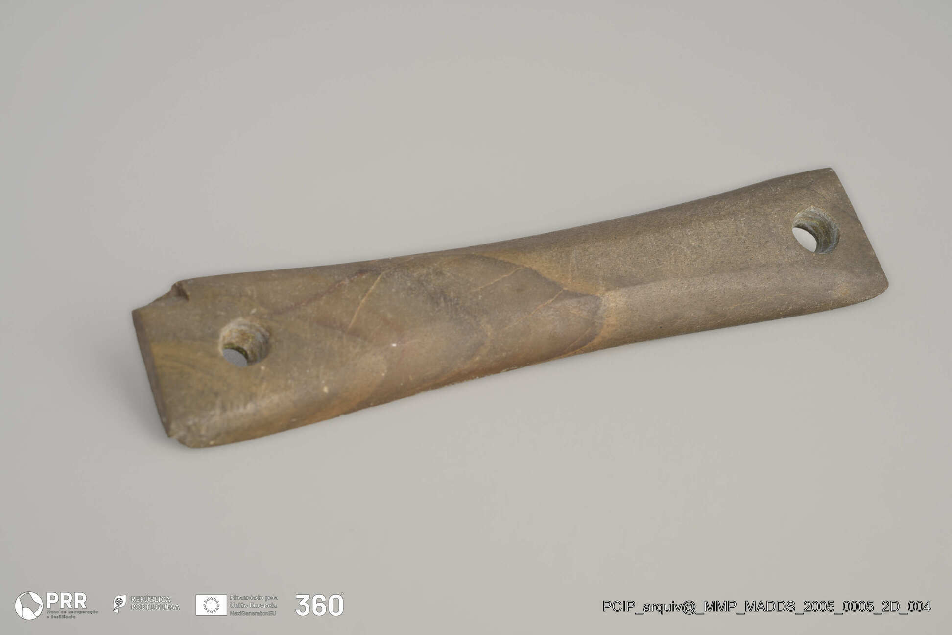 Matéria/Técnica: Xisto; Cronologia: III - III milénio a.C; Autoria: Desconhecida; Dimensões (cm): 2,2 x 9,9 x 0,7.