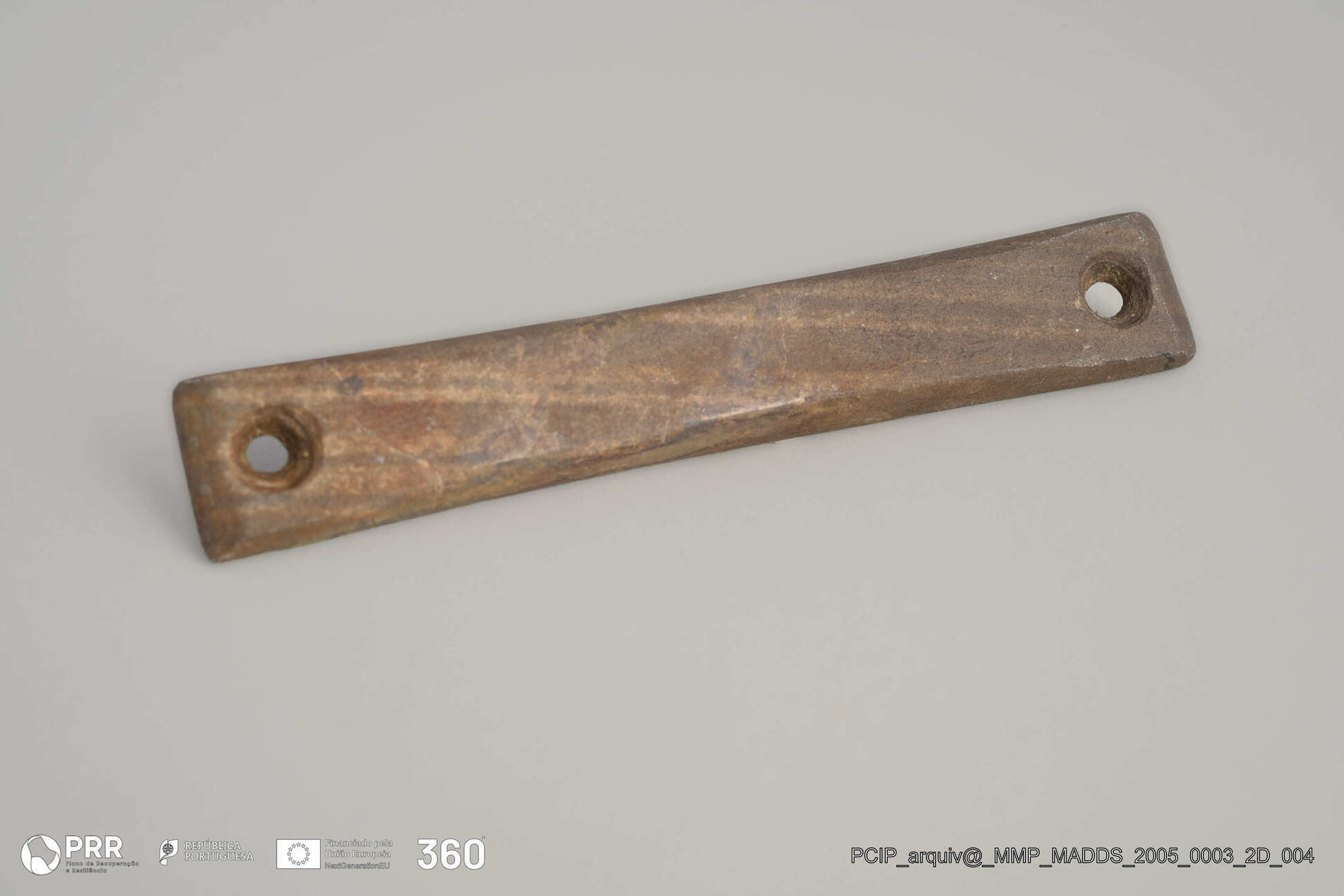 Matéria/Técnica: Xisto; Cronologia: III - III milénio a.C; Autoria: Desconhecida; Dimensões (cm): 9,6 x 1,6 x 0,6.