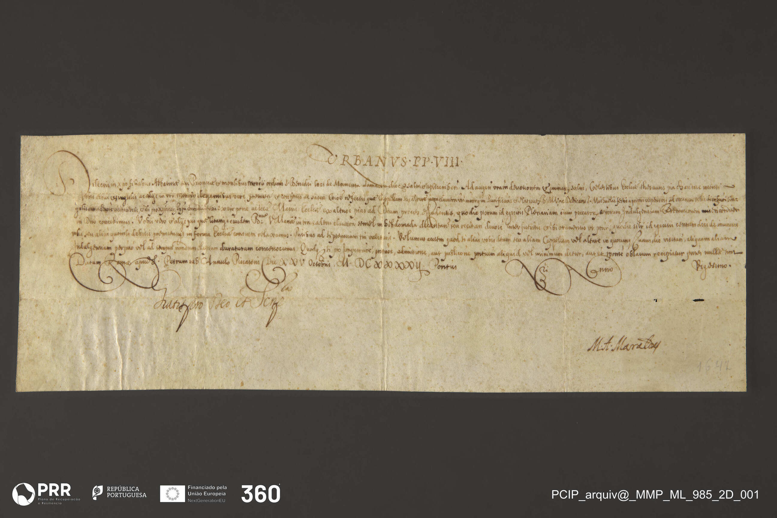 Matéria/Técnica: Escrita de breves à pena em letra caligráfica.; Cronologia: 1642; Autoria: Desconhecida; Dimensões (cm): Altura: 15 x Largura: 42,6.