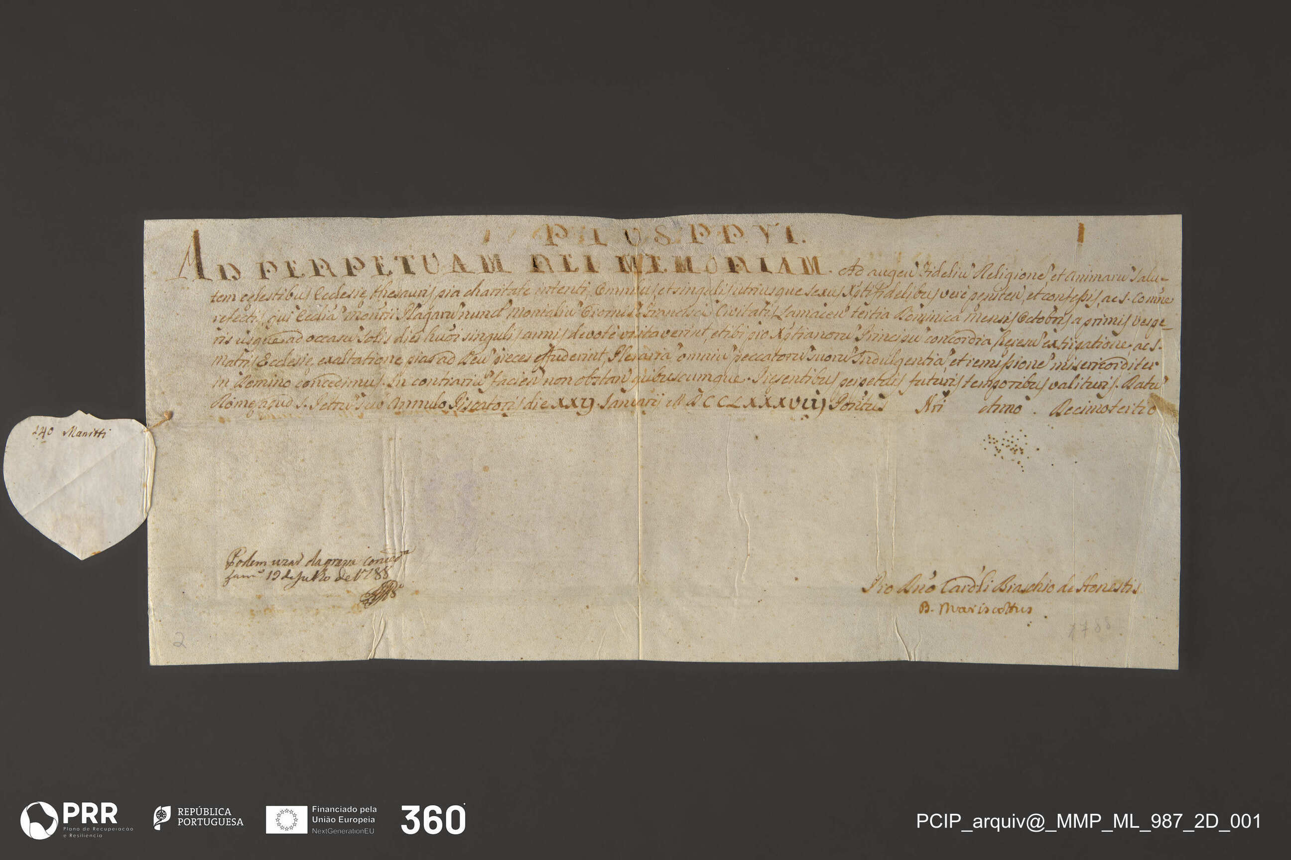 Matéria/Técnica: Escrito à pena em letra caligráfica moderna; Cronologia: 1788; Autoria: Desconhecida; Dimensões (cm): Altura: 18 x Largura: 41,7.