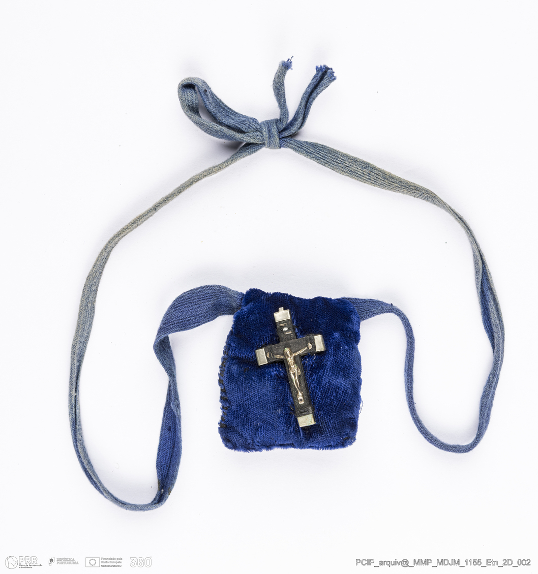 Matéria/Técnica: Veludo, fita de algodão, crucifixo em madeira e metal; Cronologia: Séc. XX; Autoria: Desconhecida; Dimensões: Altura: 6 cm x Largura: 5 cm.