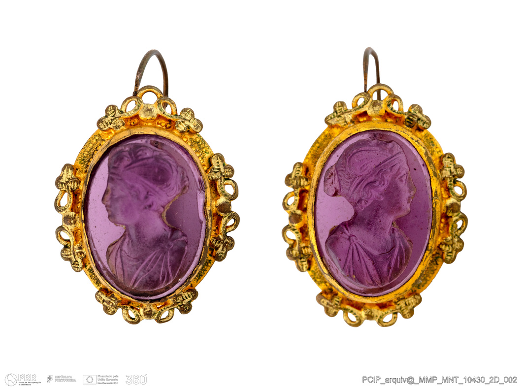 Matéria/Técnica: Metal dourado; massa vítrea lilás (ametista?).; Cronologia: Romântico; Autoria: Desconhecida; Dimensões (cm): Largura: 1,9 cm; Comprimento: 2,9 cm; Peso 4g .