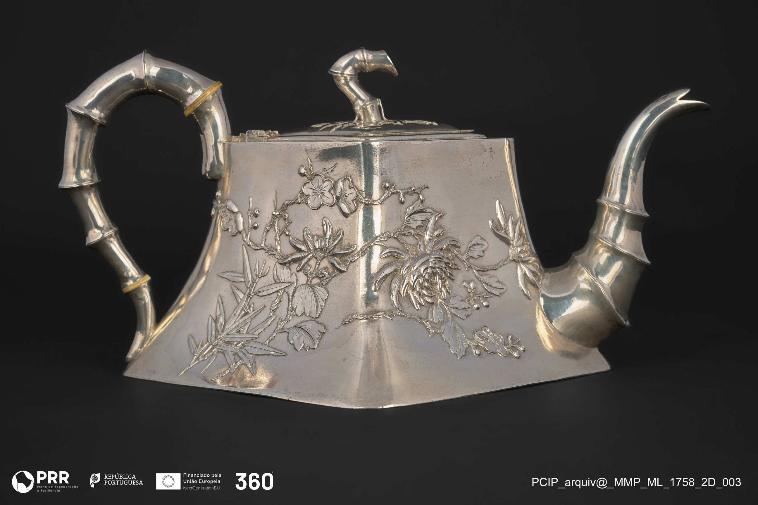 Matéria/Técnica: Prata fundida e cinzelada; Cronologia: 1895-1905; Autoria: Wo Kwong; Dimensões (cm): Altura: 12,3 x Comprimento: 24.