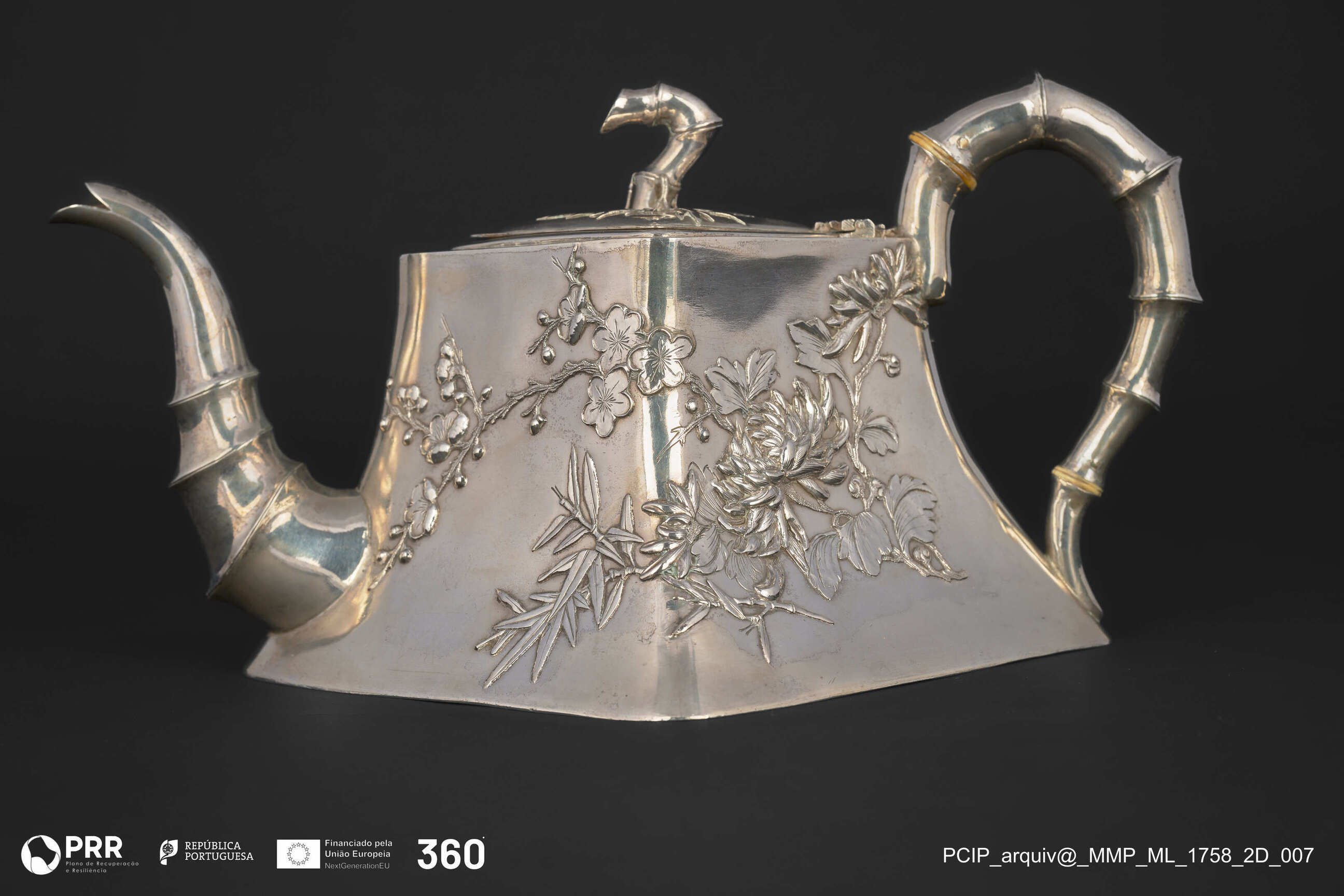 Matéria/Técnica: Prata fundida e cinzelada; Cronologia: 1895-1905; Autoria: Wo Kwong; Dimensões (cm): Altura: 12,3 x Comprimento: 24.