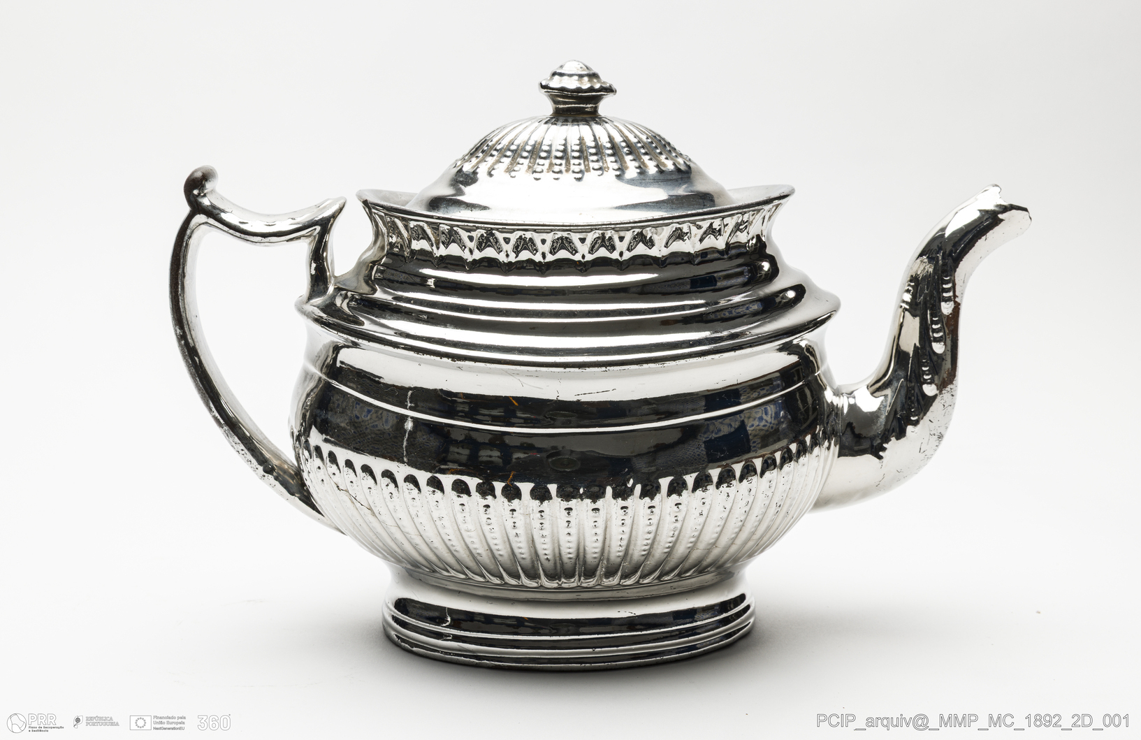Matéria/Técnica: Barro lustrado moldado. Vidrado metalizado simulando prata; Cronologia: século XVIII; Autoria: Desconhecido. Staffordshire. Inglaterra; Dimensões (cm): Altura: 18,2; Largura: 27,1.
