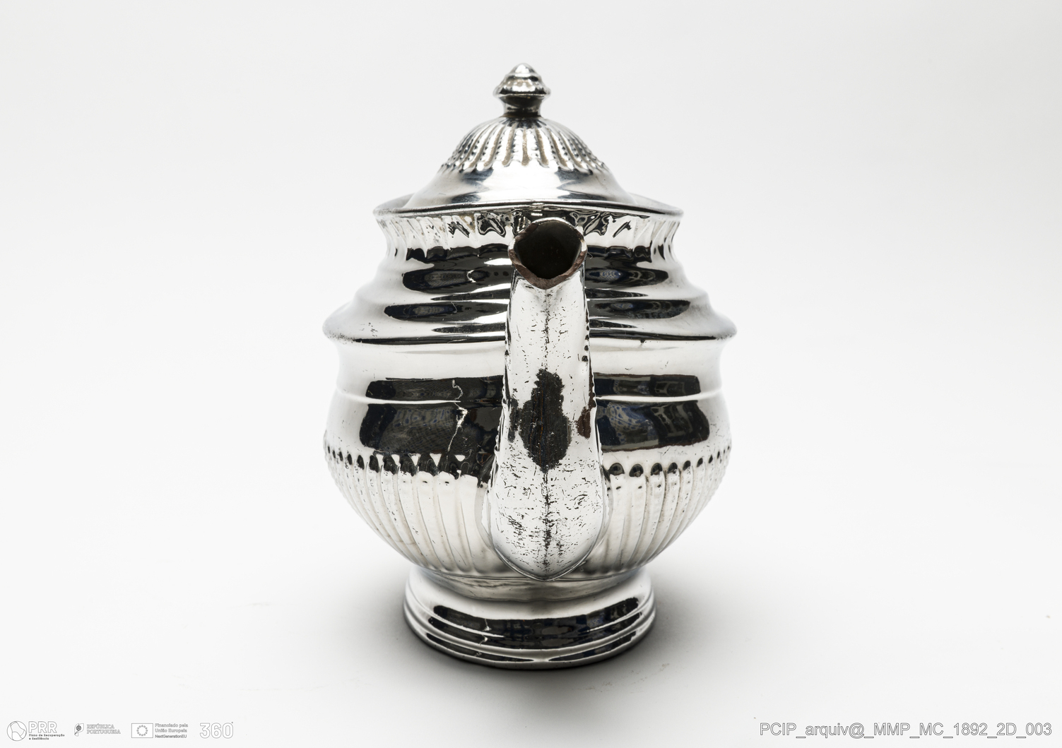 Matéria/Técnica: Barro lustrado moldado. Vidrado metalizado simulando prata; Cronologia: século XVIII; Autoria: Desconhecido. Staffordshire. Inglaterra; Dimensões (cm): Altura: 18,2; Largura: 27,1.