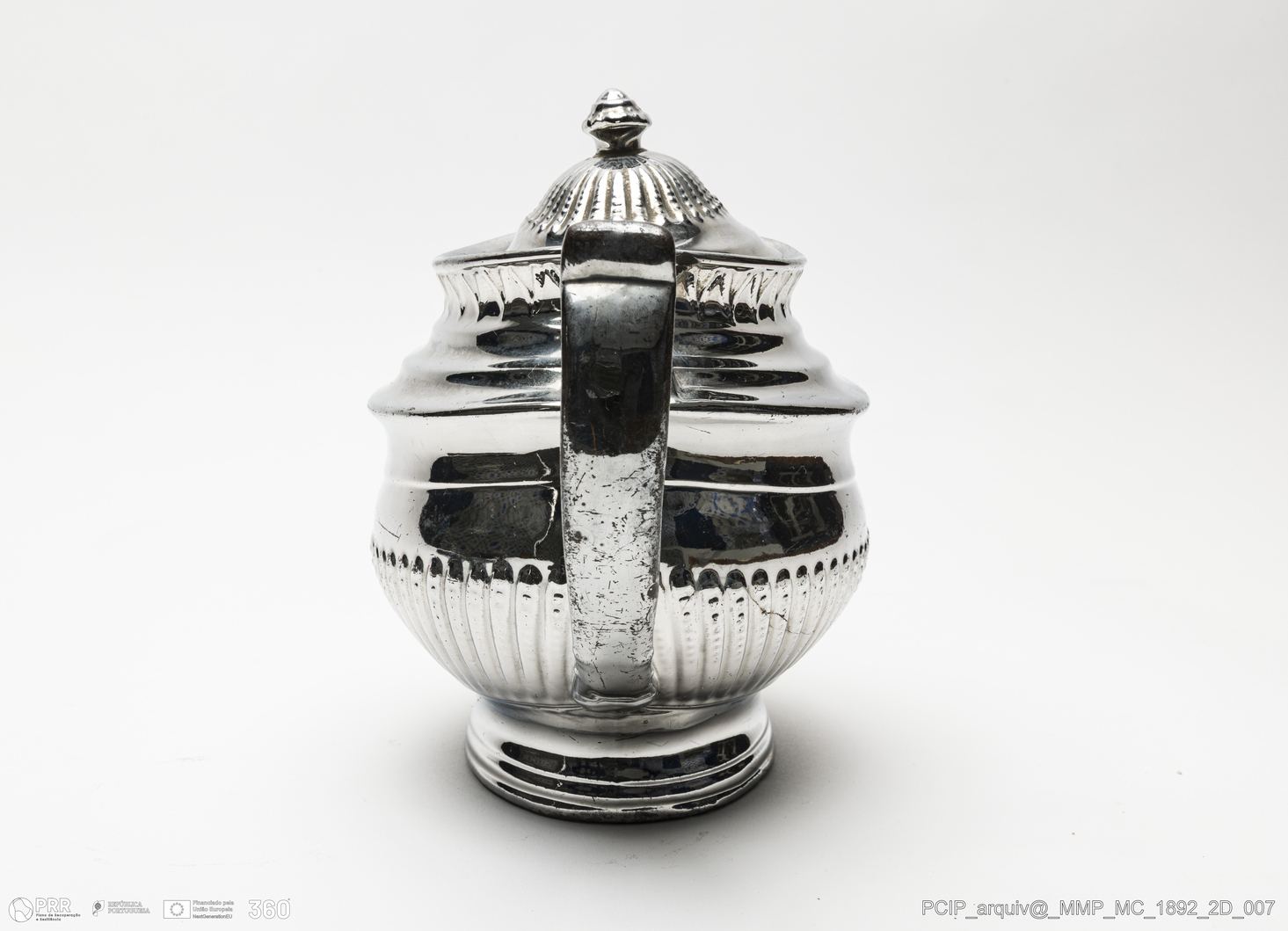 Matéria/Técnica: Barro lustrado moldado. Vidrado metalizado simulando prata; Cronologia: século XVIII; Autoria: Desconhecido. Staffordshire. Inglaterra; Dimensões (cm): Altura: 18,2; Largura: 27,1.