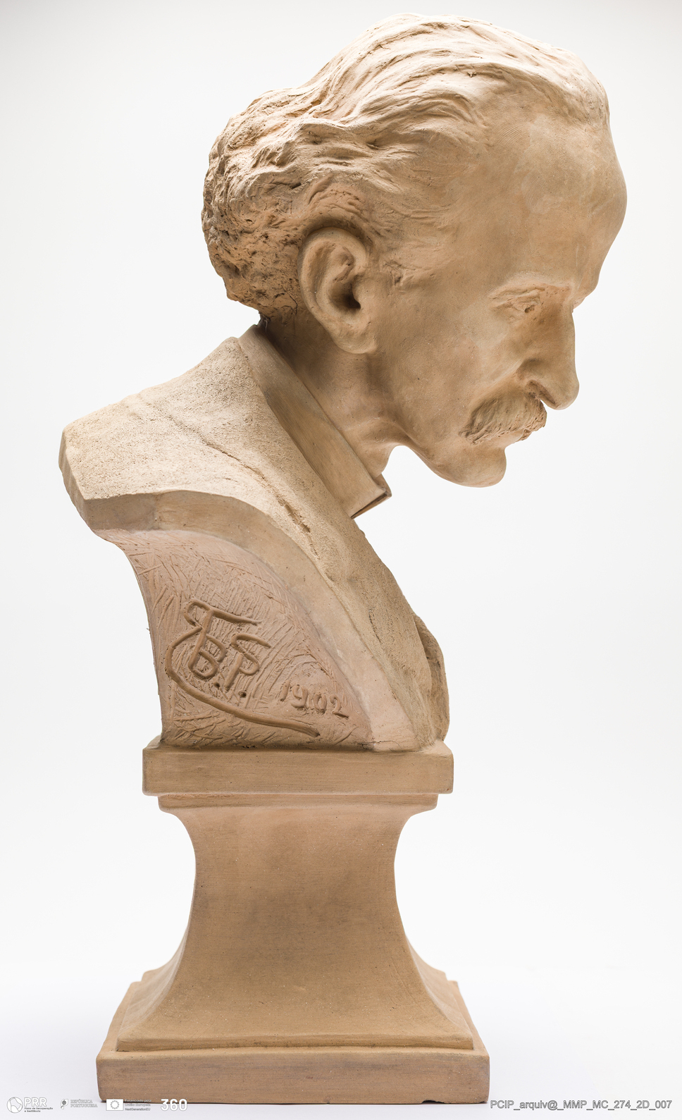 Matéria/Técnica: Barro branco modelado e moldado; Cronologia: 1902-1905; Autoria: Rafael Bordalo Pinheiro / Fábrica Bordalo Pinheiro, Caldas da Rainha, Portugal; Dimensões (cm): Altura: 47; Largura: 24.