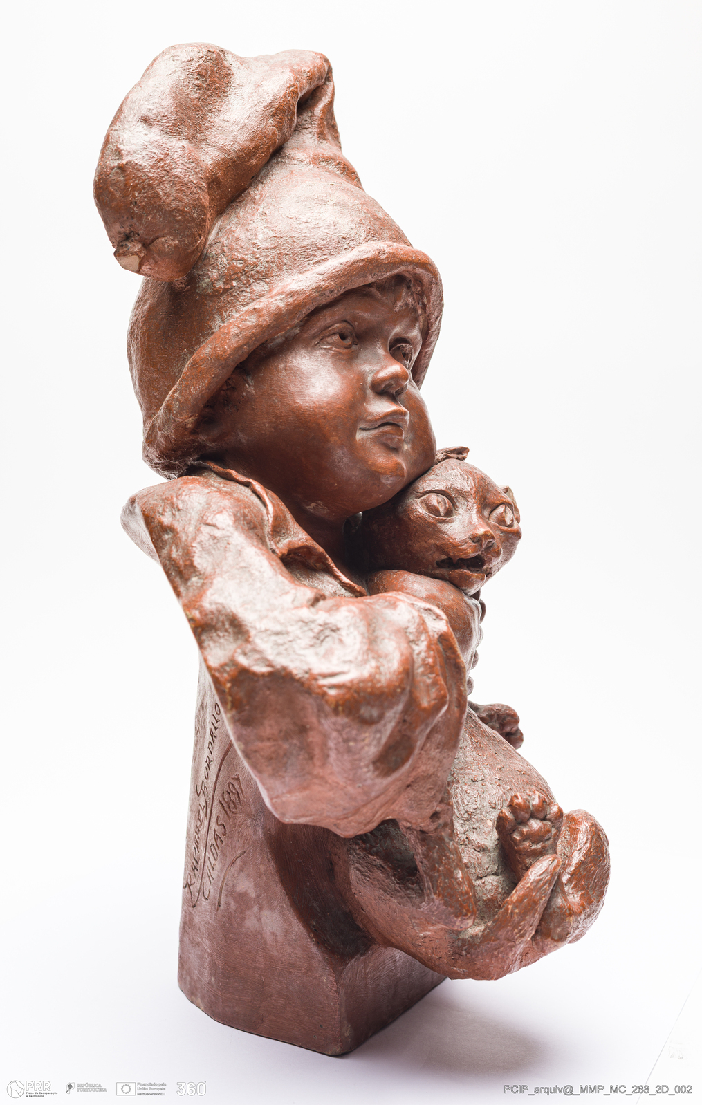 Matéria/Técnica: Barro vermelho moldado e modelado. Vidrado transparente; Cronologia: 1897; Autoria: Rafael Bordalo Pinheiro / Fábrica Bordalo Pinheiro, Caldas da Rainha, Portugal; Dimensões (cm): Altura: 37; Largura: 26.