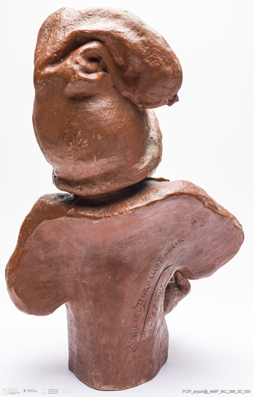 Matéria/Técnica: Barro vermelho moldado e modelado. Vidrado transparente; Cronologia: 1897; Autoria: Rafael Bordalo Pinheiro / Fábrica Bordalo Pinheiro, Caldas da Rainha, Portugal; Dimensões (cm): Altura: 37; Largura: 26.