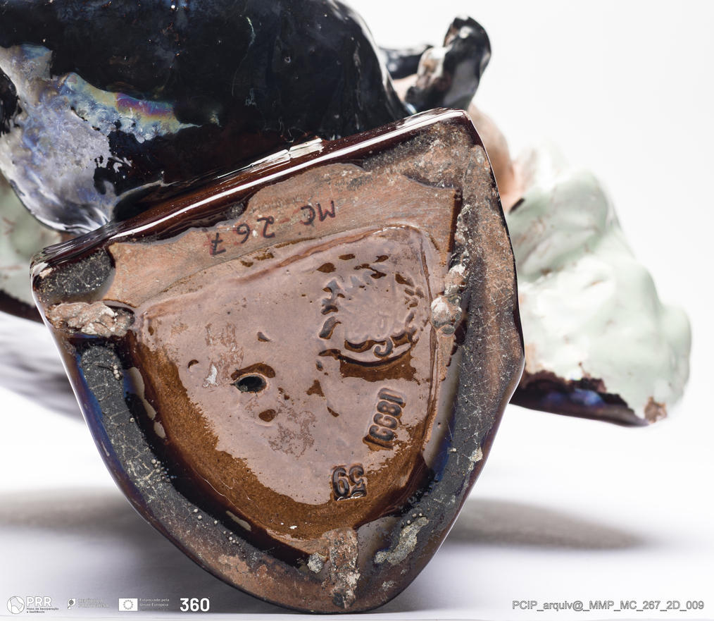 Matéria/Técnica: Barro vermelho modelado e moldado. Vidrado polícromo: verde, vermelho. Branco e castanho; Cronologia: 1899; Autoria: Rafael Bordalo Pinheiro / Fábrica Bordalo Pinheiro, Caldas da Rainha, Portugal; Dimensões (cm): Altura: 37; Largura: 24.