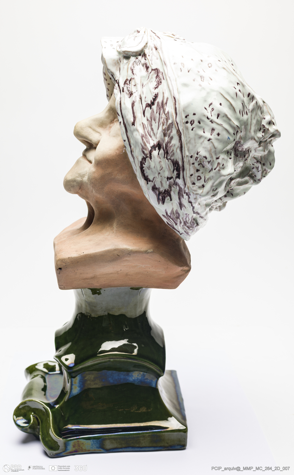 Matéria/Técnica: Barro vermelho modelado e moldado. Vidrado polícromo: verde de cobre, castanho de manganês e branco de estanho; Cronologia: 1889; Autoria: Rafael Bordalo Pinheiro / Fábrica De Faianças das Caldas da Rainha, Portugal; Dimensões (cm): Altura: 42; Largura: 19.