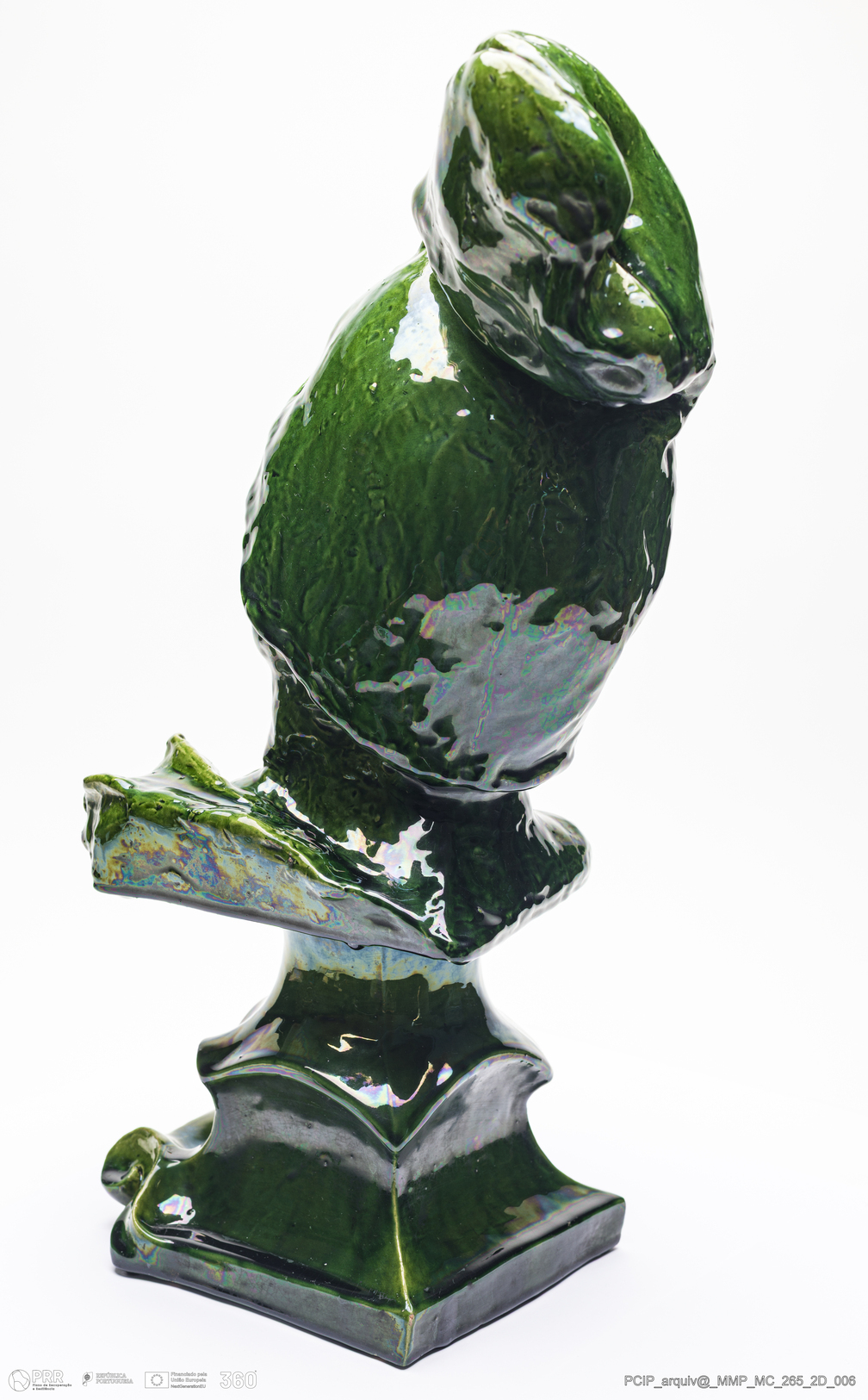 Matéria/Técnica: Barro vermelho modelado e moldado. Vidrado monocromo verde; Cronologia: 1884-1905; Autoria: Rafael Bordalo Pinheiro / Fábrica De Faianças das Caldas da Rainha, Portugal; Dimensões (cm): Altura: 48; Largura: 19.