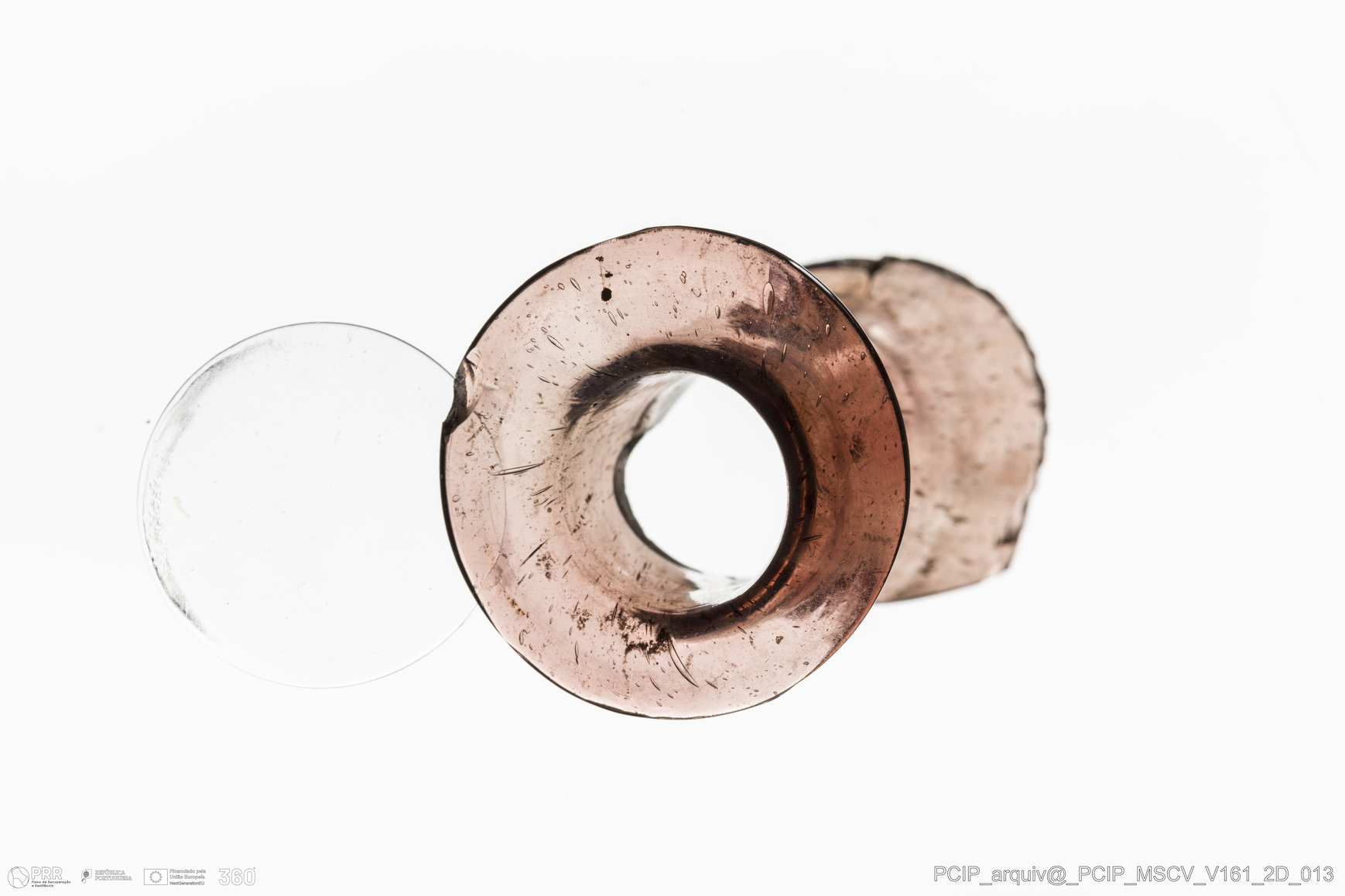Matéria/Técnica: Vidro; Cronologia: Século XVII; Autoria: Desconhecida; Dimensões: Diâmetro Bordo: 27mm.