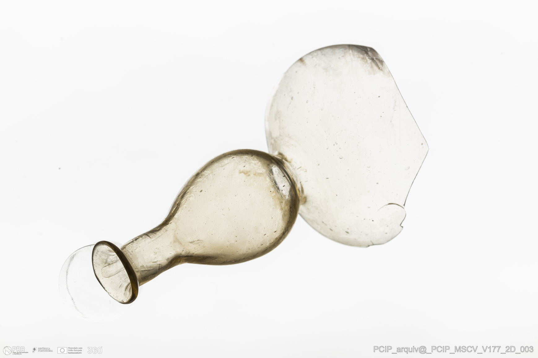 Matéria/Técnica: Vidro; Cronologia: Século XVII; Autoria: Desconhecida; Dimensões: Diâmetro Bordo: 17mm.