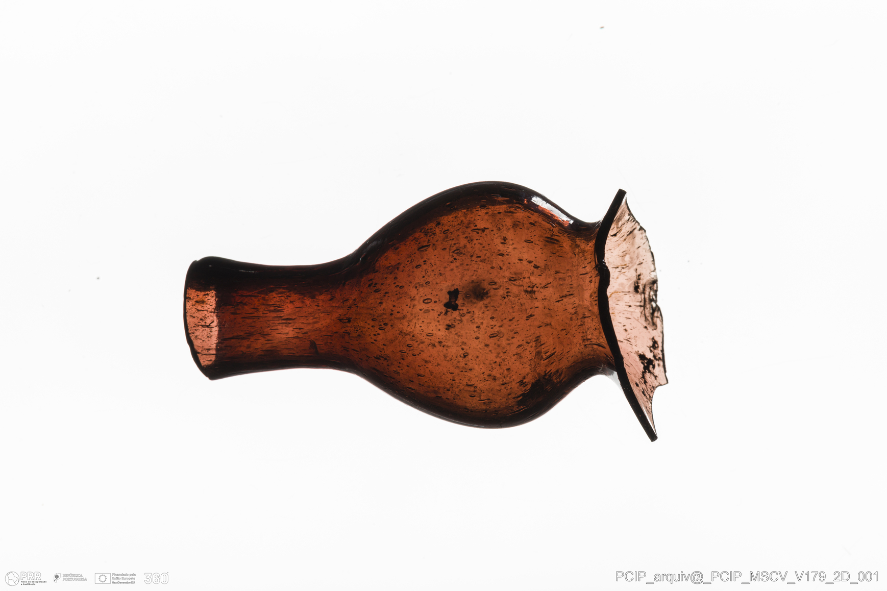 Matéria/Técnica: Vidro; Cronologia: Século XVII; Autoria: Desconhecida; Dimensões: Diâmetro bordo: 14mm.