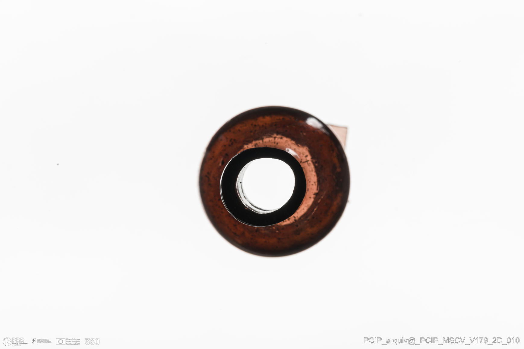 Matéria/Técnica: Vidro; Cronologia: Século XVII; Autoria: Desconhecida; Dimensões: Diâmetro bordo: 14mm.