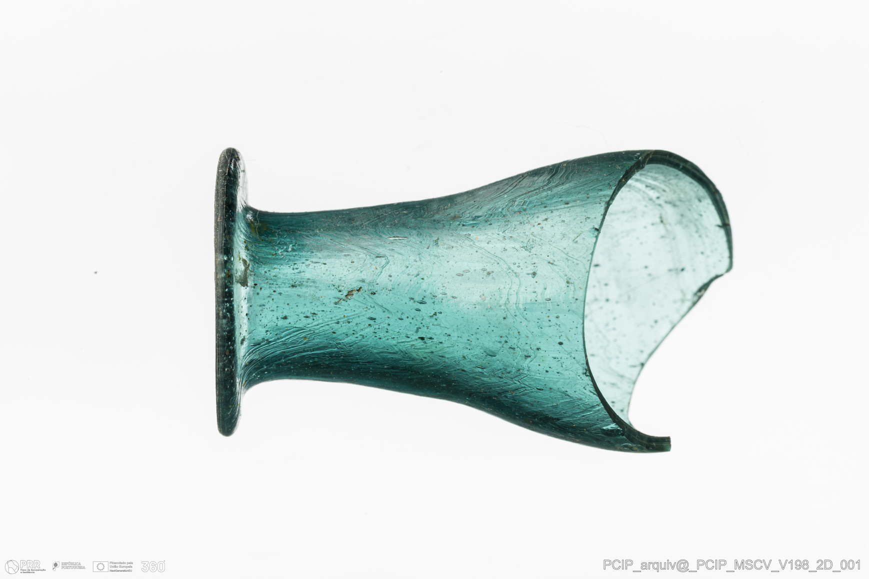 Matéria/Técnica: Vidro; Cronologia: Século XVII; Autoria: Desconhecida; Dimensões: Diâmetro bordo: 23mm.
