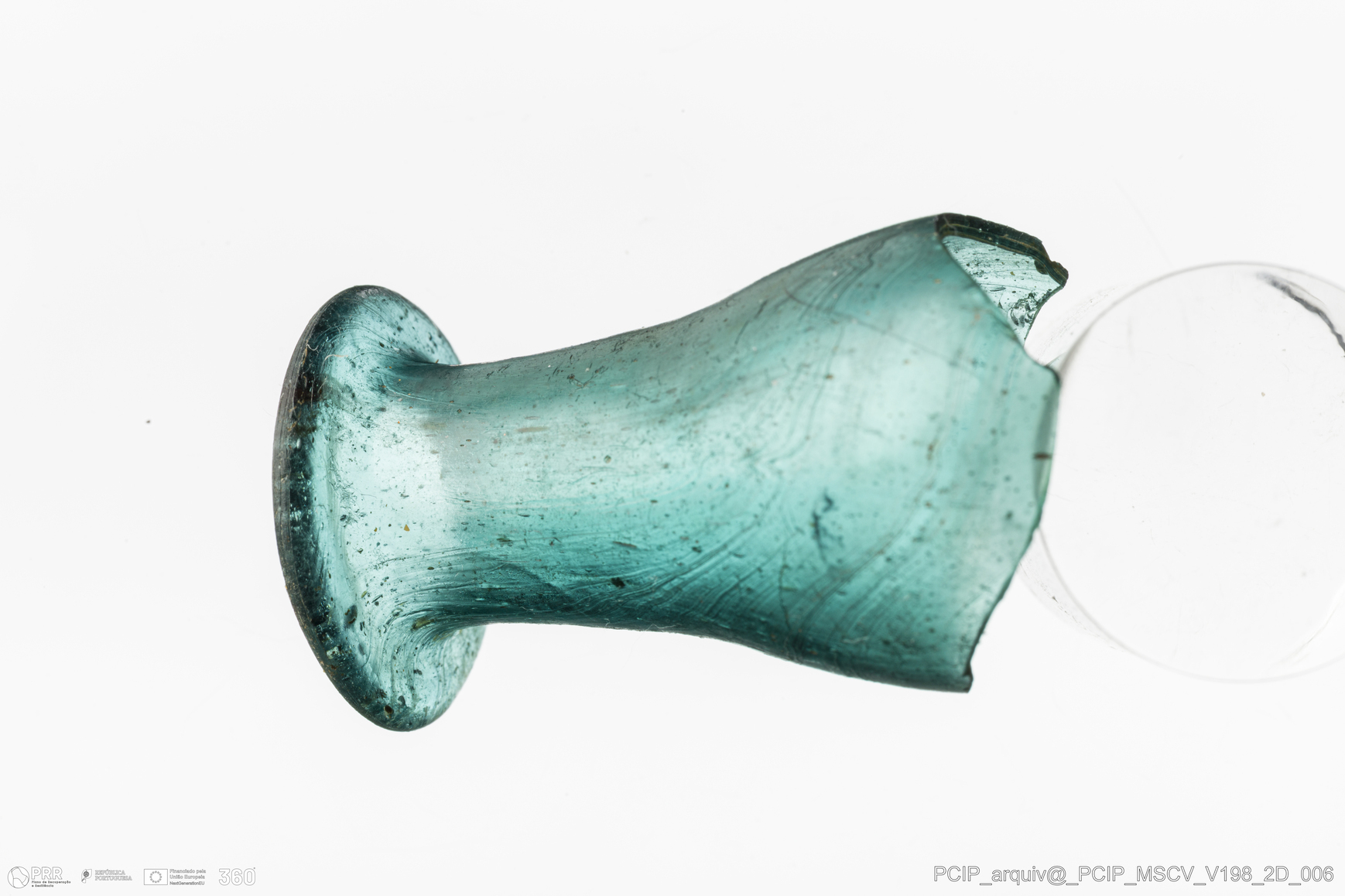 Matéria/Técnica: Vidro; Cronologia: Século XVII; Autoria: Desconhecida; Dimensões: Diâmetro bordo: 23mm.